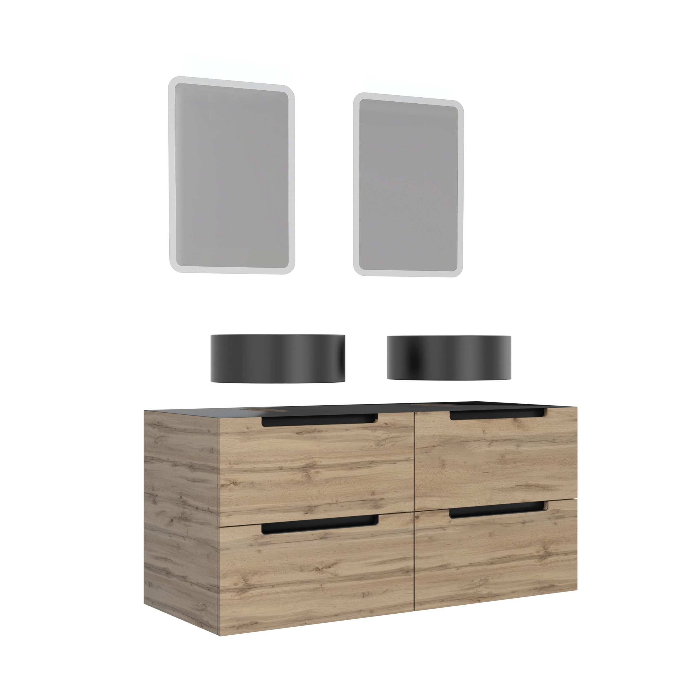 0 avis TIMBER Meuble Salle de Bains 120cm 4 Tiroirs Chêne Naturel, 2 Vasques Noires 41x41x15cm, 2 Miroirs 55x75cm