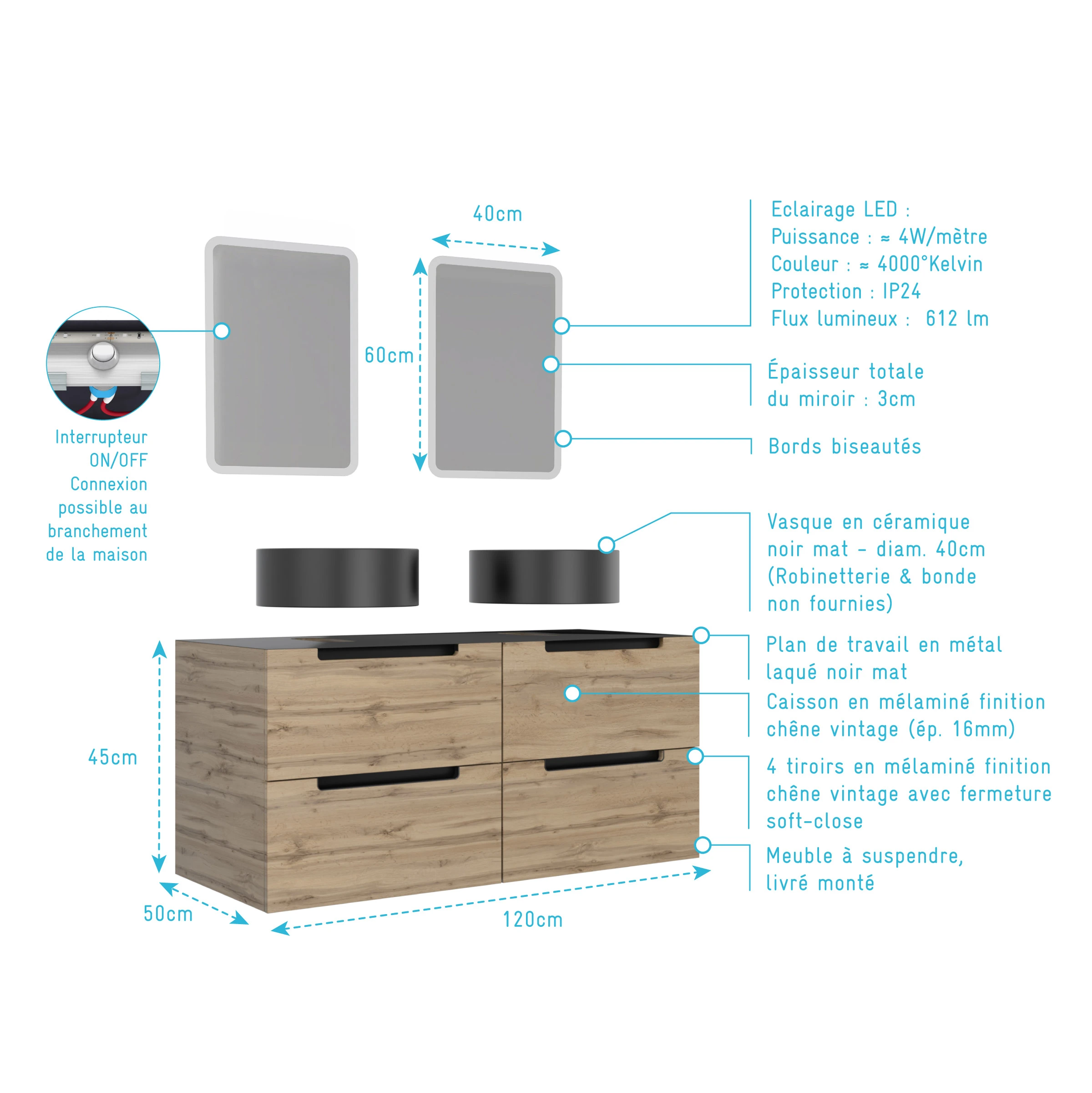 Meuble salle de bains 120cm Chene et noir, Vasques rondes Diam 41cm et Miroirs Led 40×60 – OMEGA