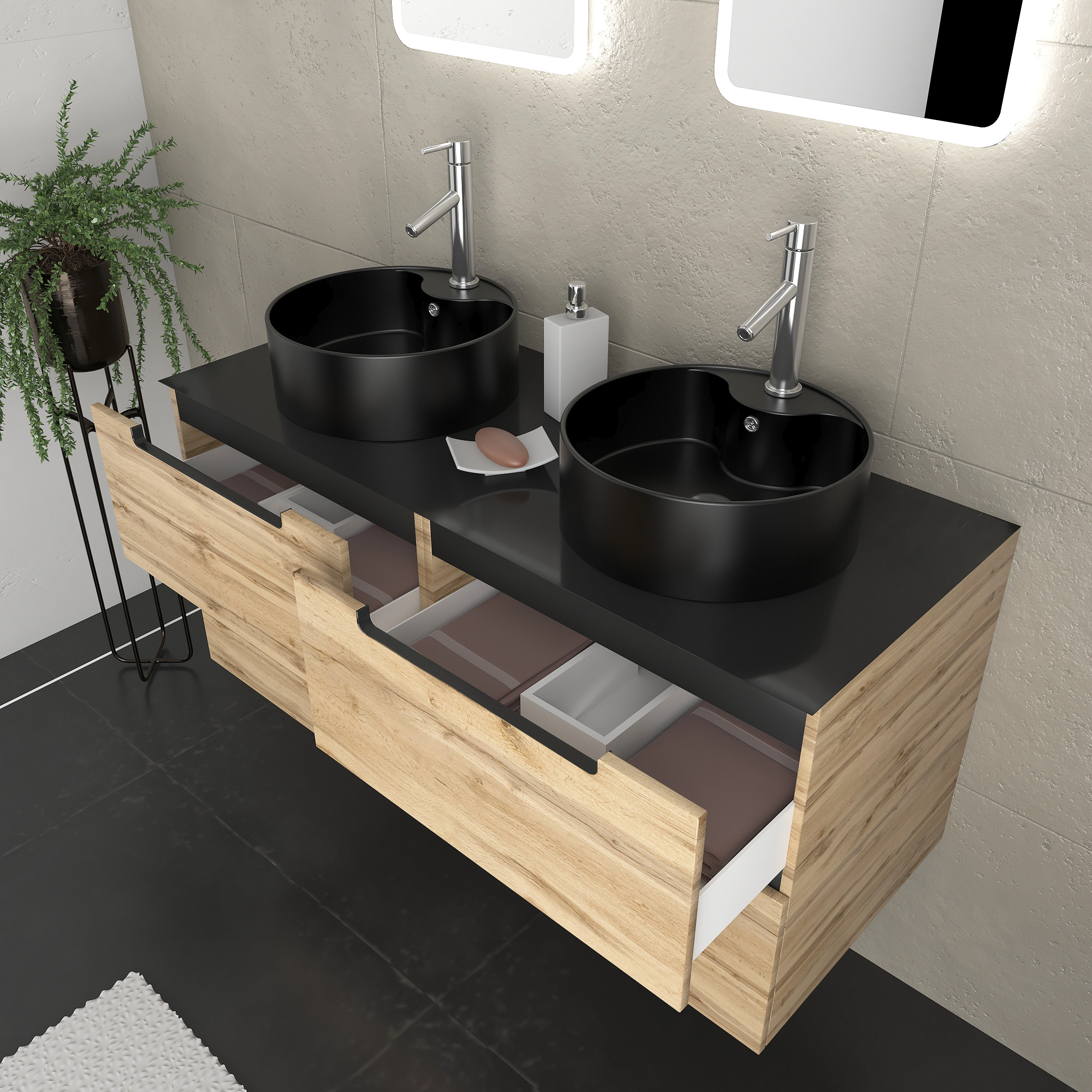 0 avis TIMBER Meuble de salle de bains 120 cm TIMBER - Décor Chêne, 2 tiroirs, Vasque noire à poser
