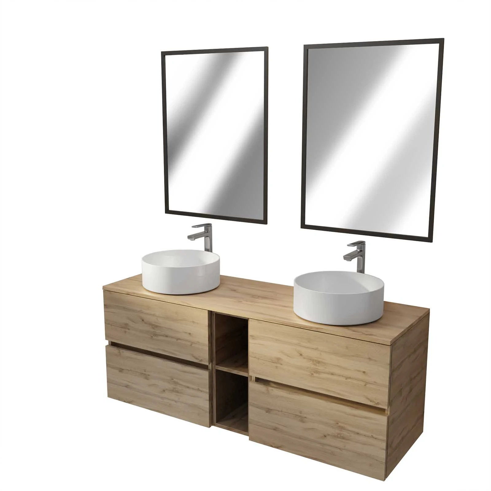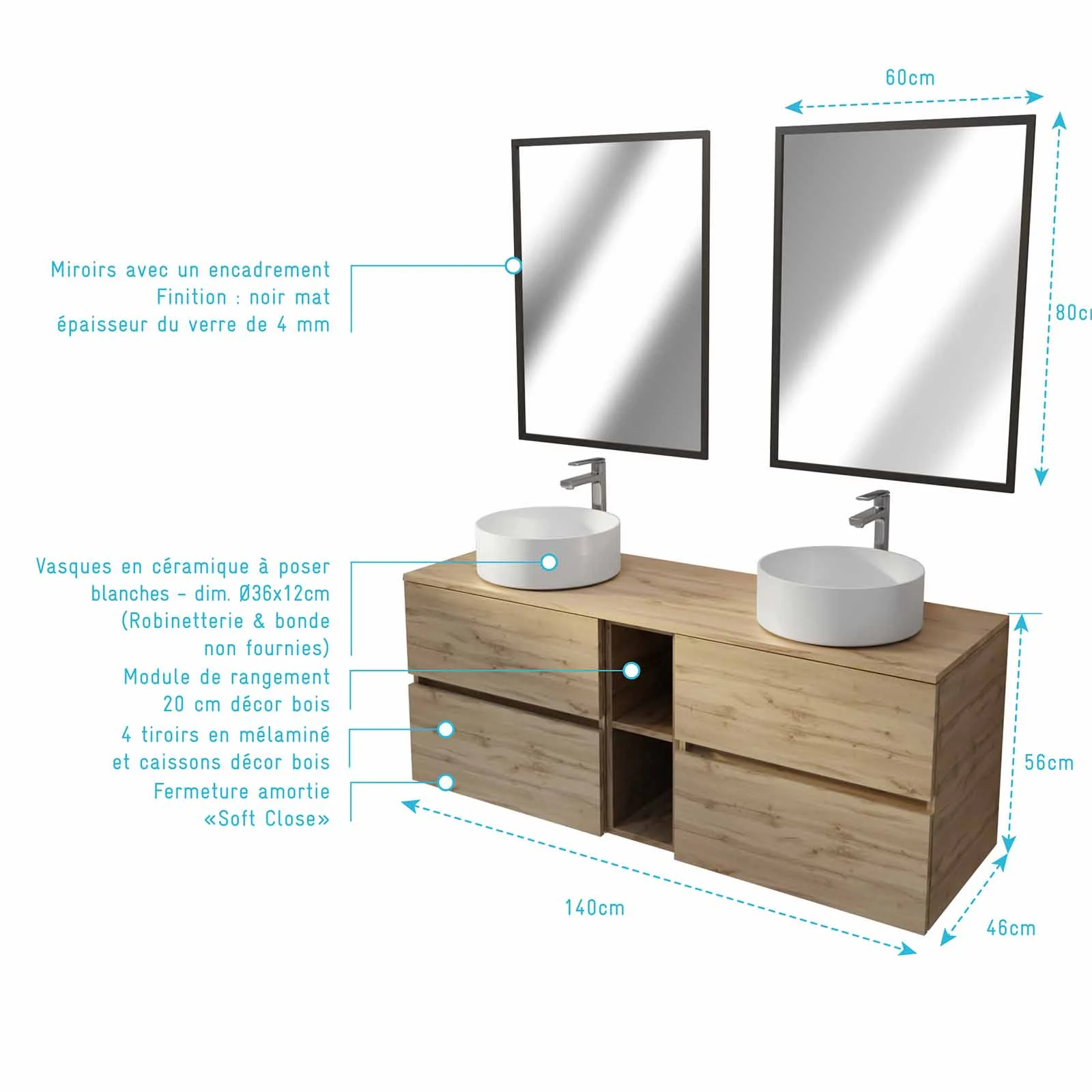 0 avis TIMBER Meuble Salle de Bains 140 TIMBER Décor Chêne 4 Tiroirs - Vasques à Poser Noires - 2 Miroirs 60x80
