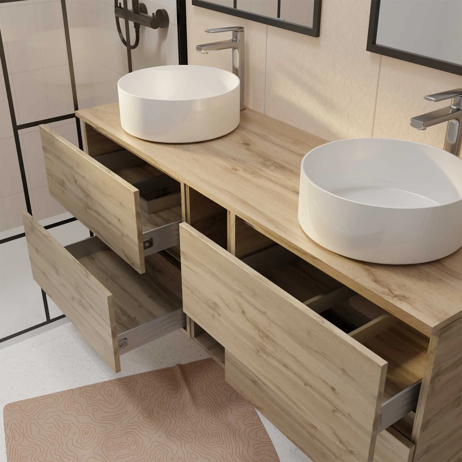 0 avis TIMBER Meuble Salle de Bains 140 TIMBER Décor Chêne 4 Tiroirs - Vasques à Poser Blanches - 2 Miroirs 60x80