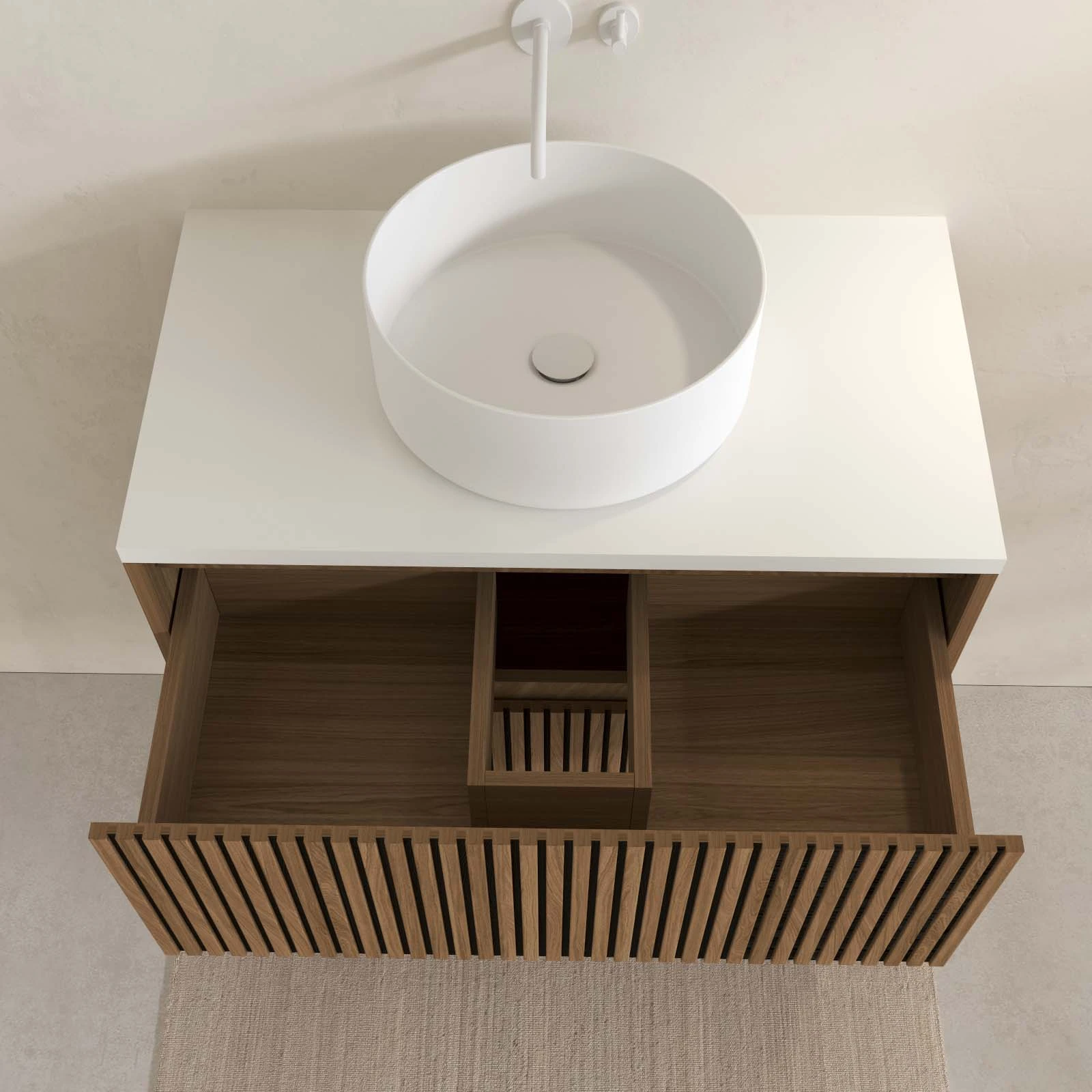 Plongez dans l’univers Japandi avec cette composition. Alliance subtile du raffinement japonais et de la douceur scandinave. Sa façade crantée bicolore bois et noir profond joue sur les reliefs pour apporter une forte présence déco à votre salle de bains, tout en conservant une esthétique épurée.