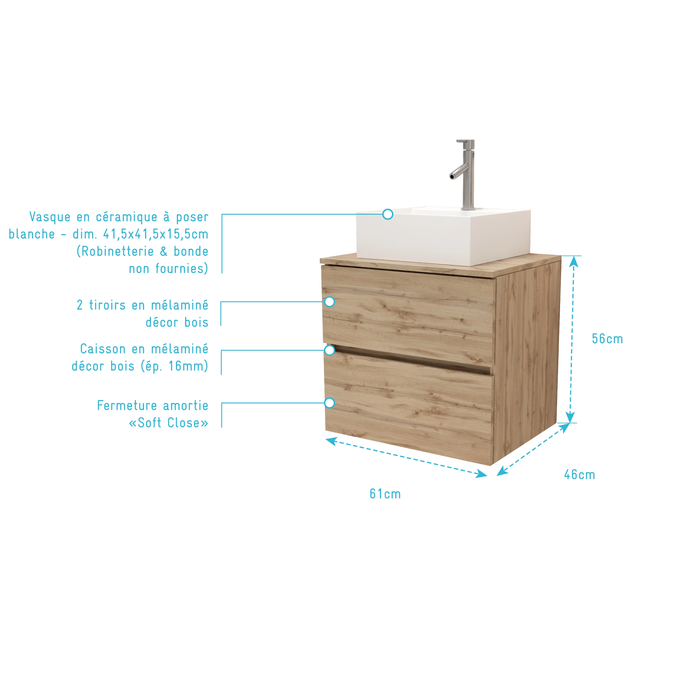 Meuble Salle de Bains 60cm 2 Tiroirs Chêne Naturel + Vasque Carrée 41x41x15cm en Céramique Blanche