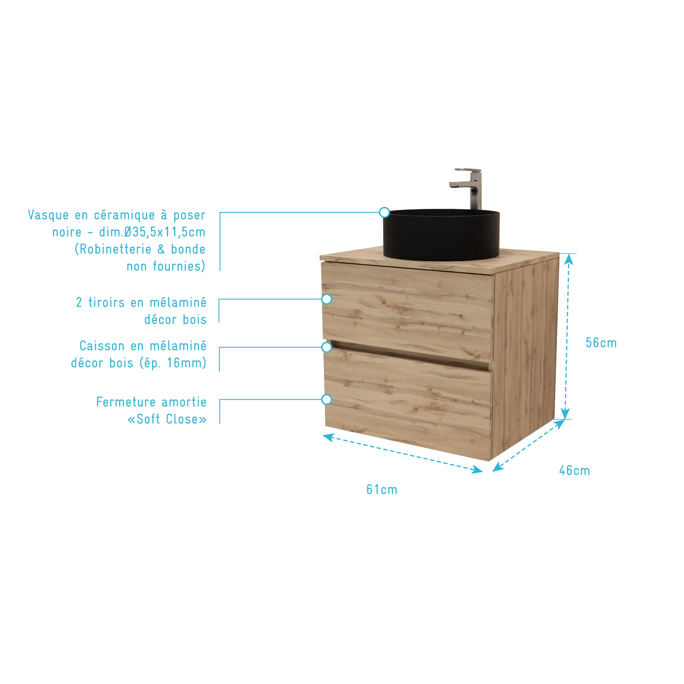 0 avis TIMBER Meuble Salle de Bains 60cm 2 Tiroirs Chêne Naturel + Vasque Ronde Diamètre 36cm en Céramique Noire