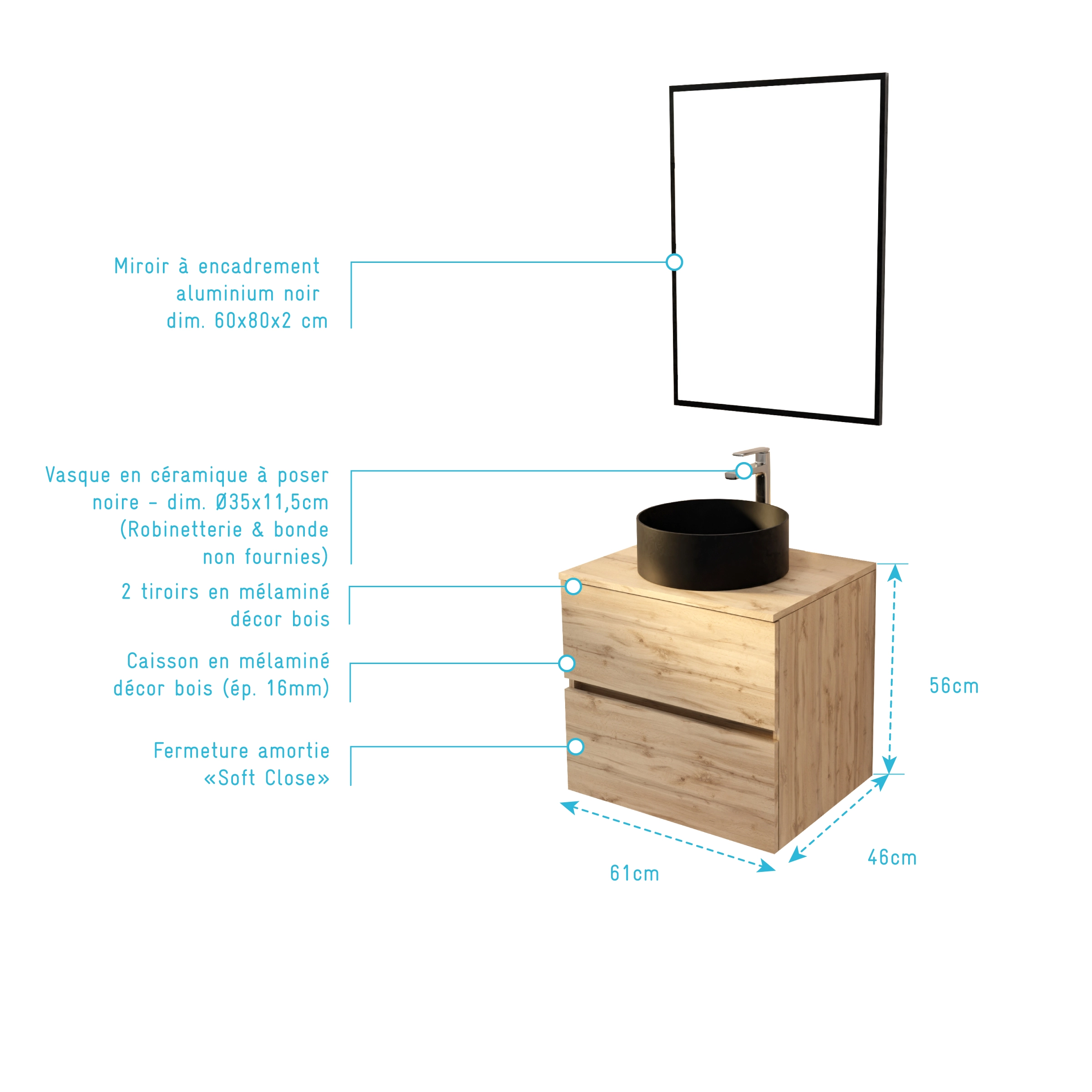 Meuble Salle de Bains 60cm 2 Tiroirs Chêne Naturel + Vasque Ronde Noire 36cm et Miroir 60x80cm