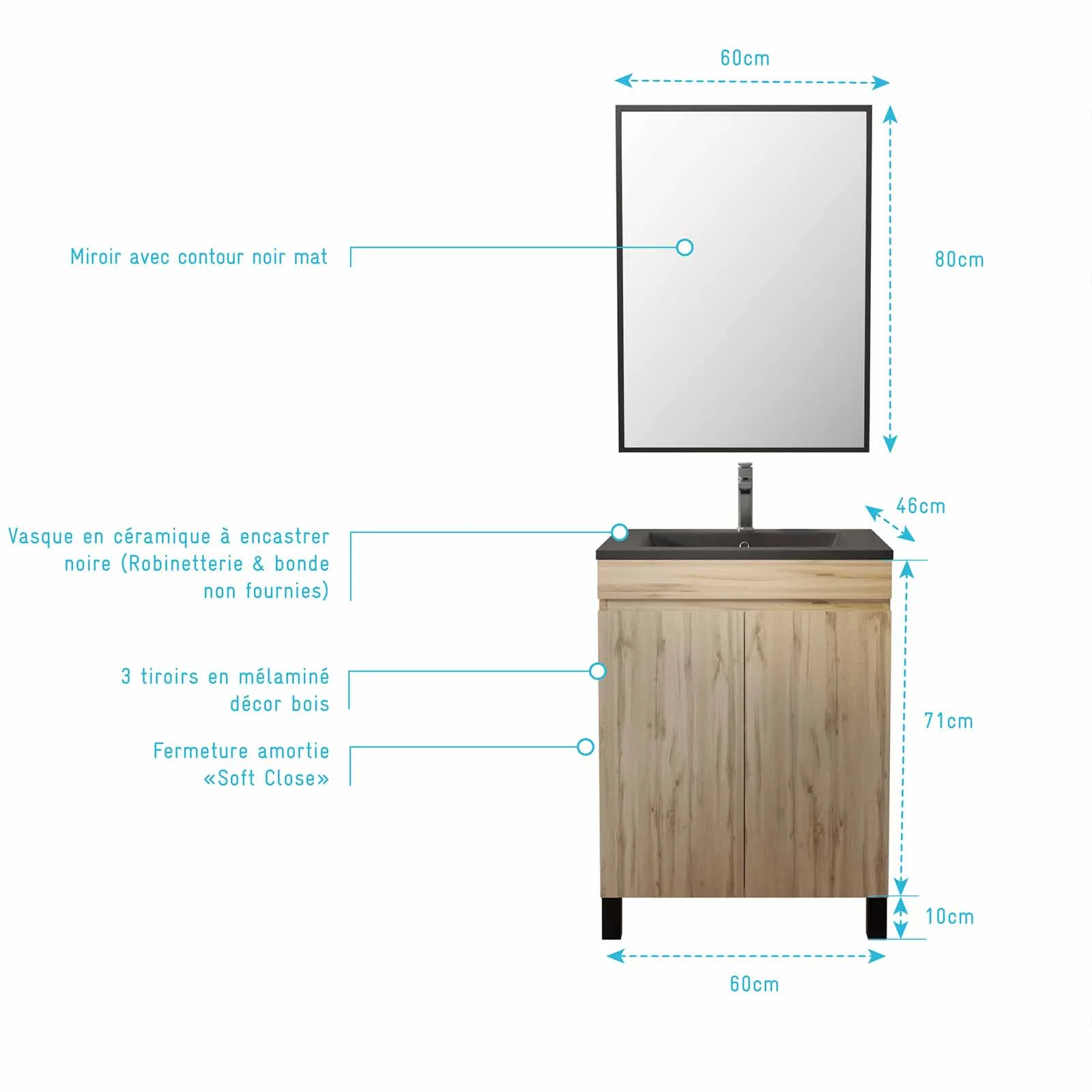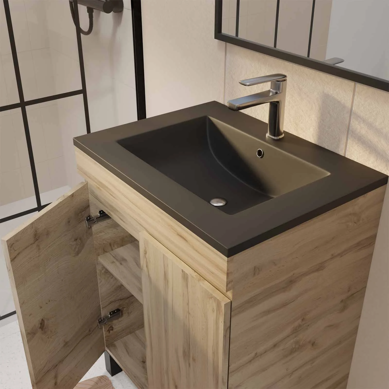 6 avis pour Meuble salle de bains 60cm décor chene naturel 2 portes – Vasque noire et Miroir – TIMBER