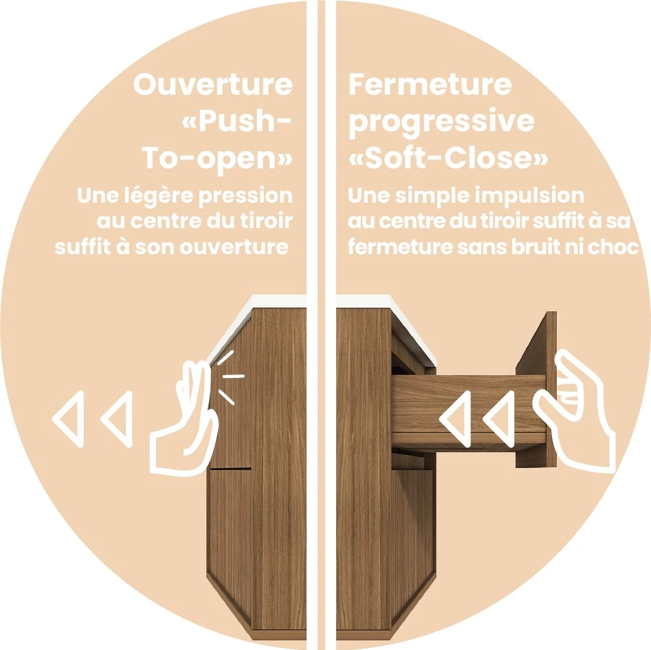 Un Design minimaliste sans poignée grâce au système push-to-open (ouverture par simple pression) et soft-close (fermeture progressive, silencieuse et fluide)..