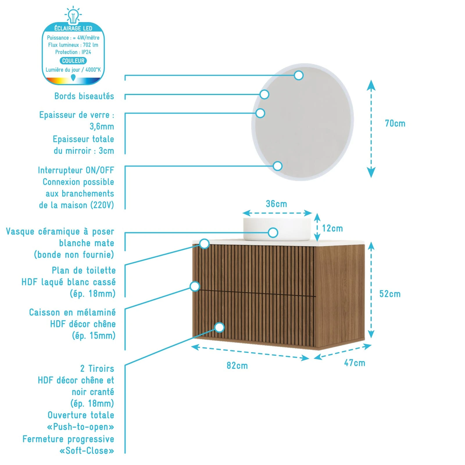 3 avis pour Meuble Salle de Bains 80 2 Tiroirs Décor Chêne et Noir – Vasque et Plan Blancs – Miroir LED 70
