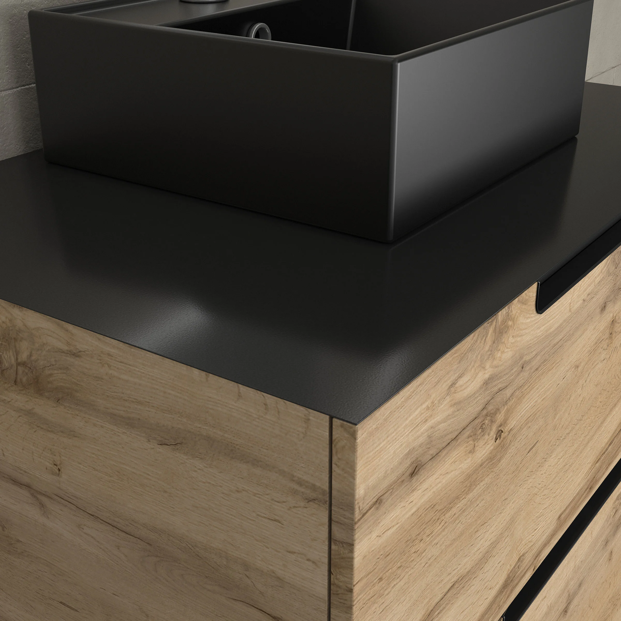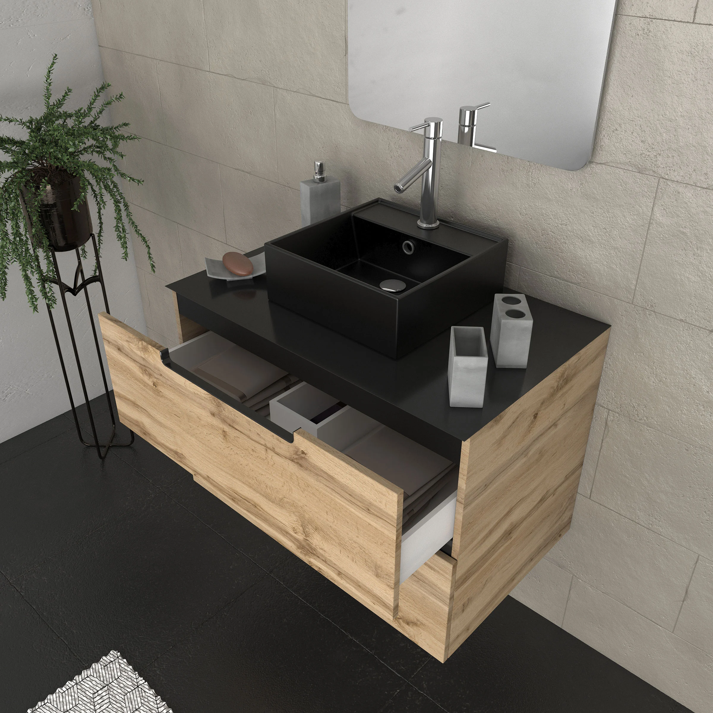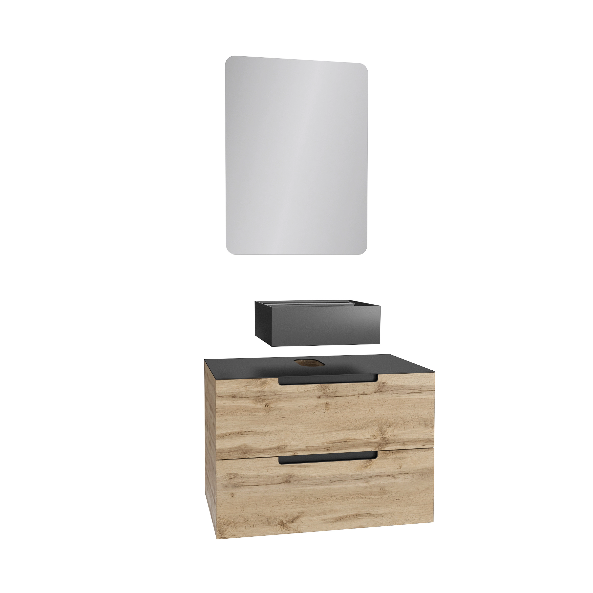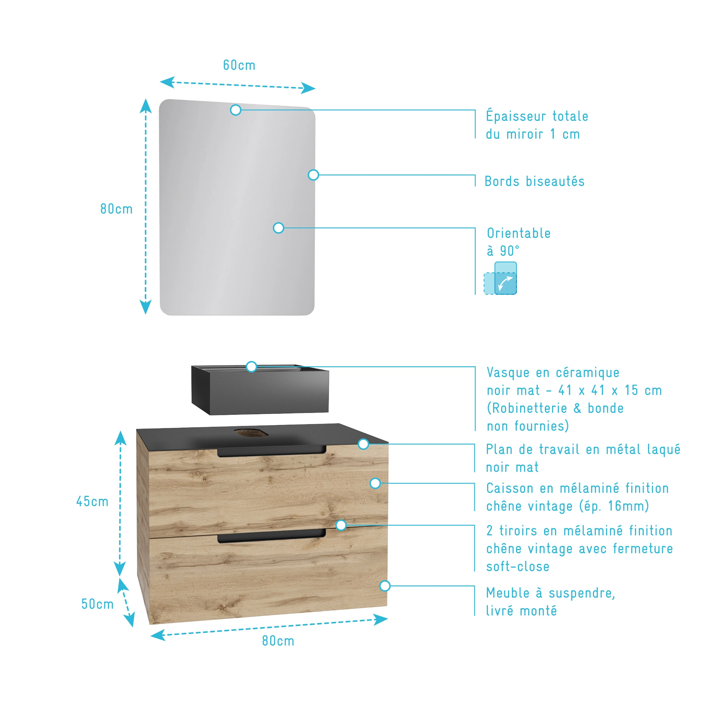 Meuble salle de bains 80 cm 2 tiroirs – Chêne et noir – Vasque carrée – Miroir 60×80 – OMEGA