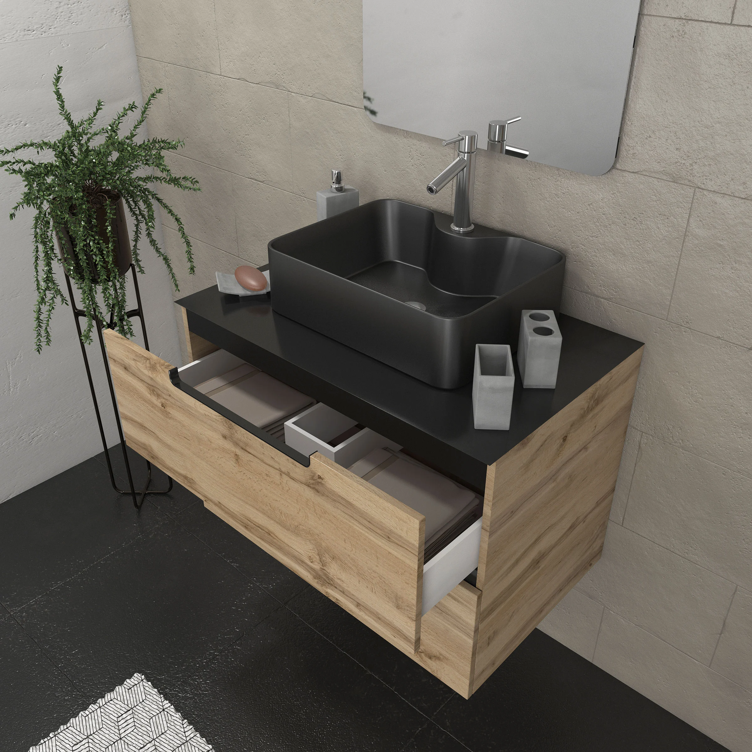 Modernisez votre salle de bain avec ce meuble à 2 tiroirs finition chêne vintage, revêtu d’un plan en métal noir mat. L’ensemble est équipé d’une vasque à poser en céramique noire et d’un miroir qui apporteront du caractère et un esprit industriel à votre pièce.