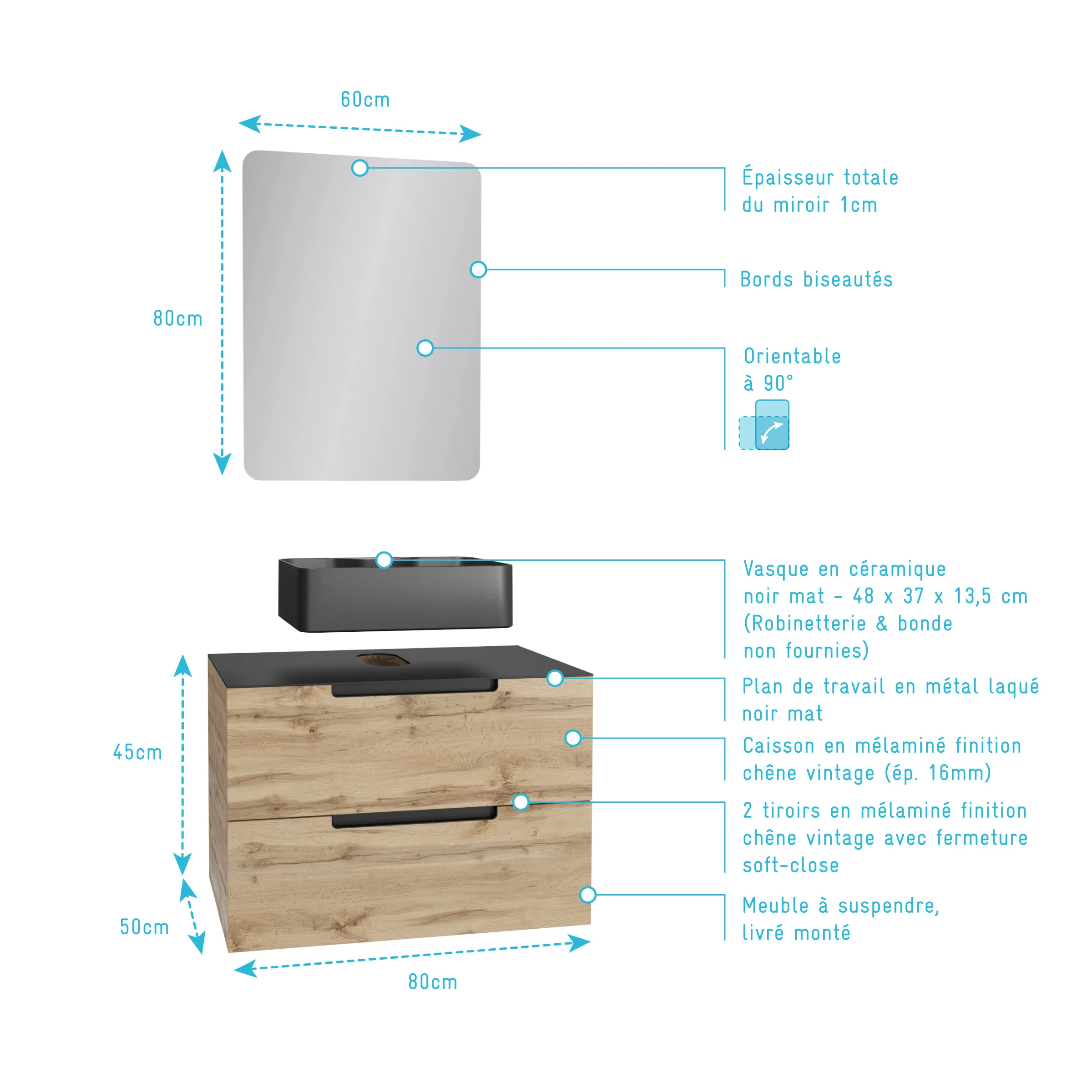 Meuble salle de bains 80 cm 2 tiroirs – Chêne et noir – Vasque rectangle – Miroir 60×80 – OMEGA