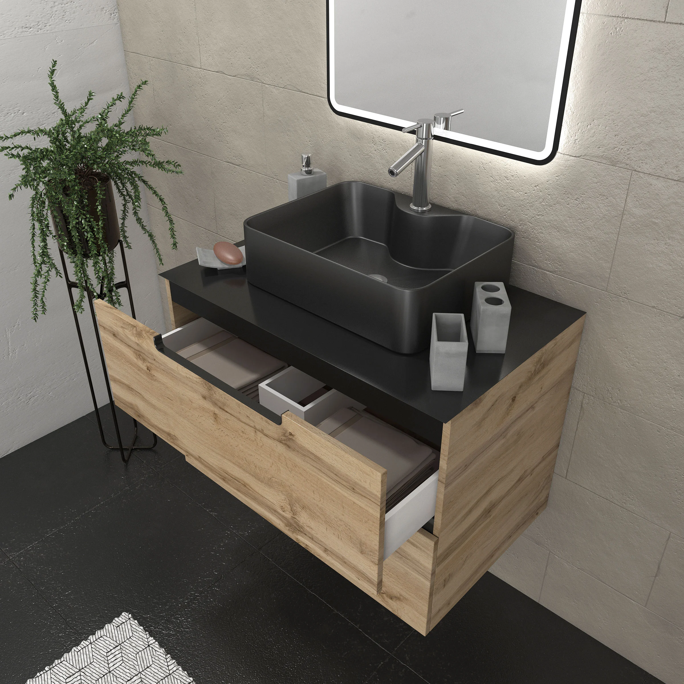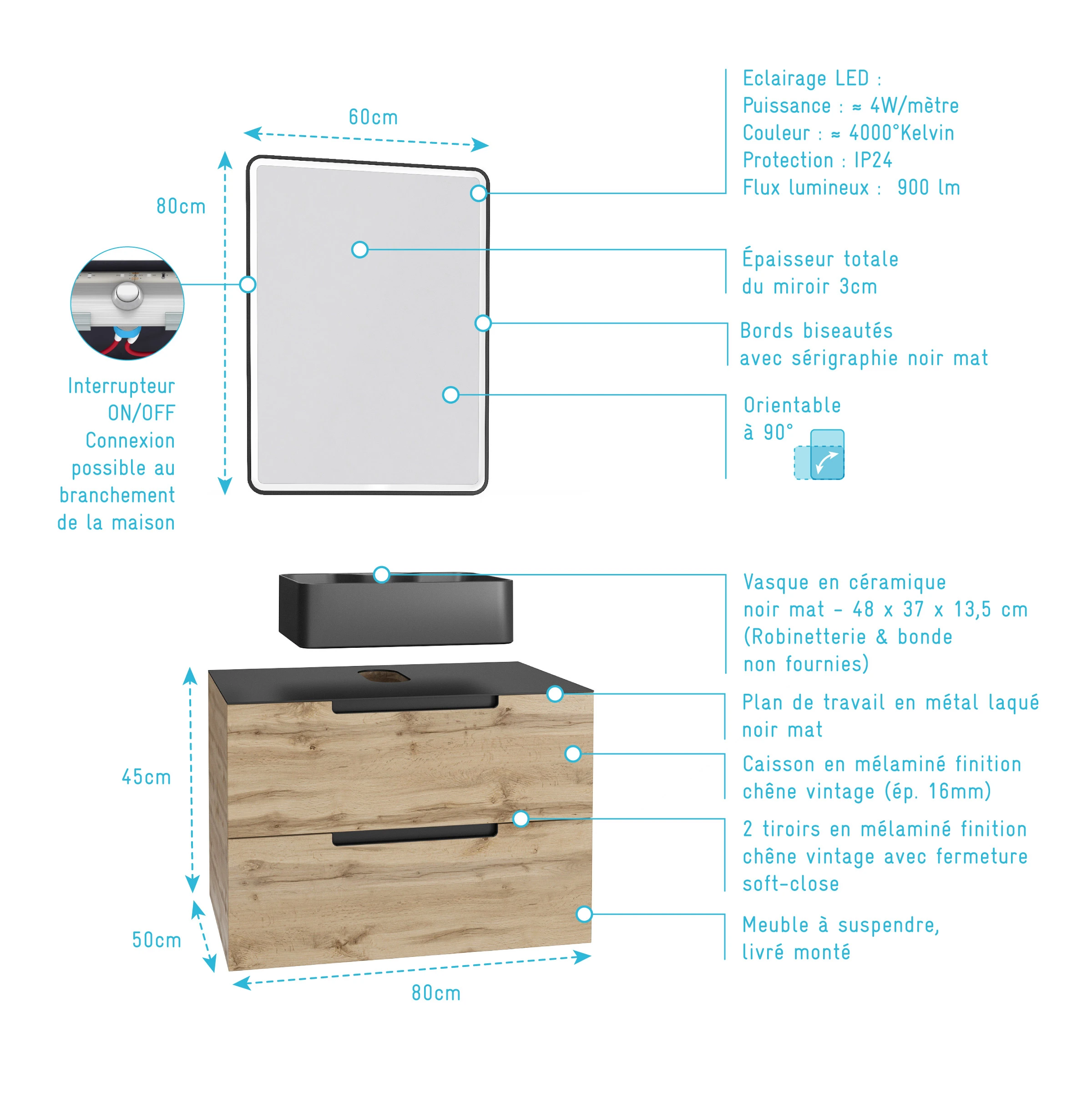 Meuble salle de bains 80 cm 2 tiroirs – Chêne et noir – Vasque rectangle – Miroir Black Led – OMEGA