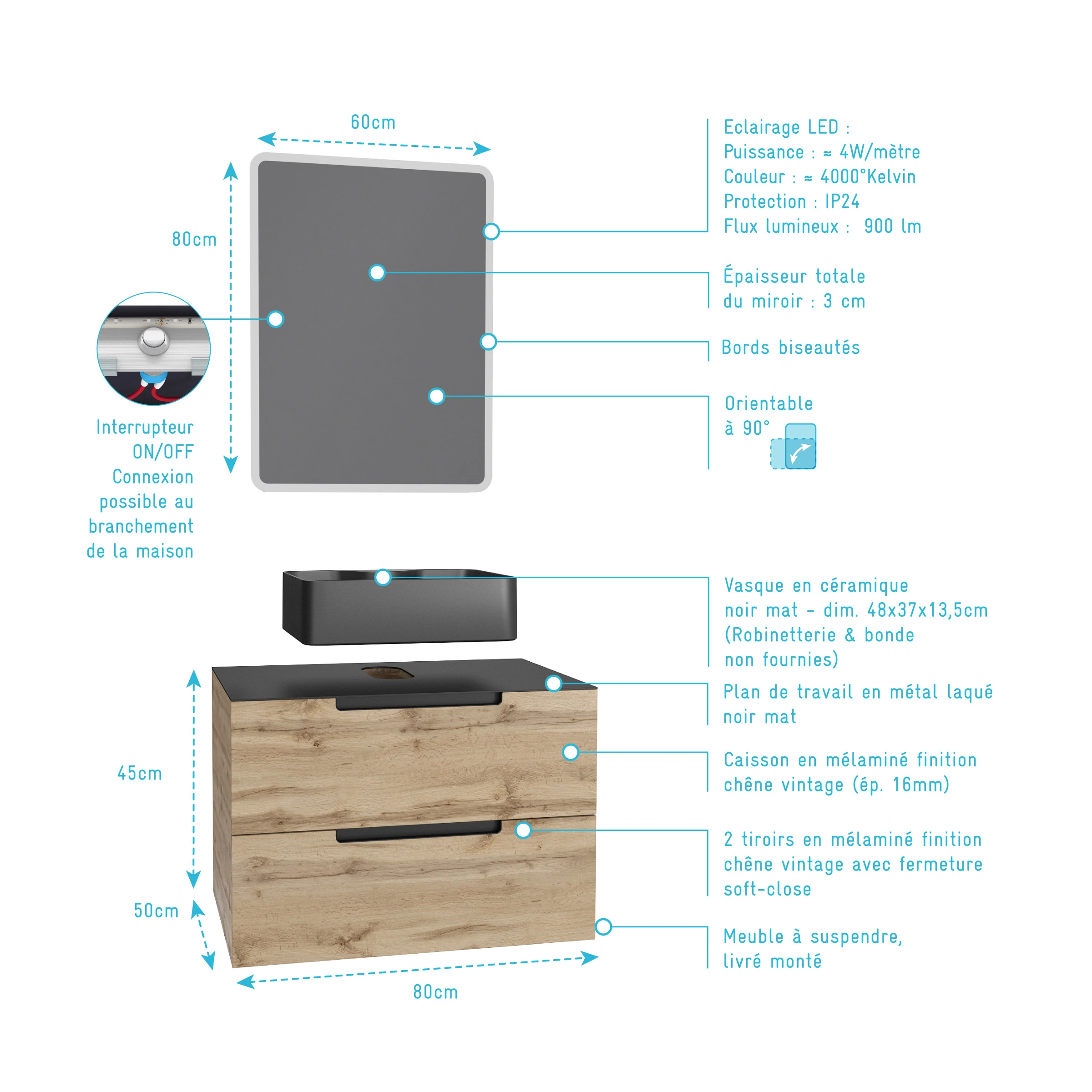 Meuble salle de bains 80 cm 2 tiroirs – Chêne et noir – Vasque rectangle – Miroir Led – OMEGA