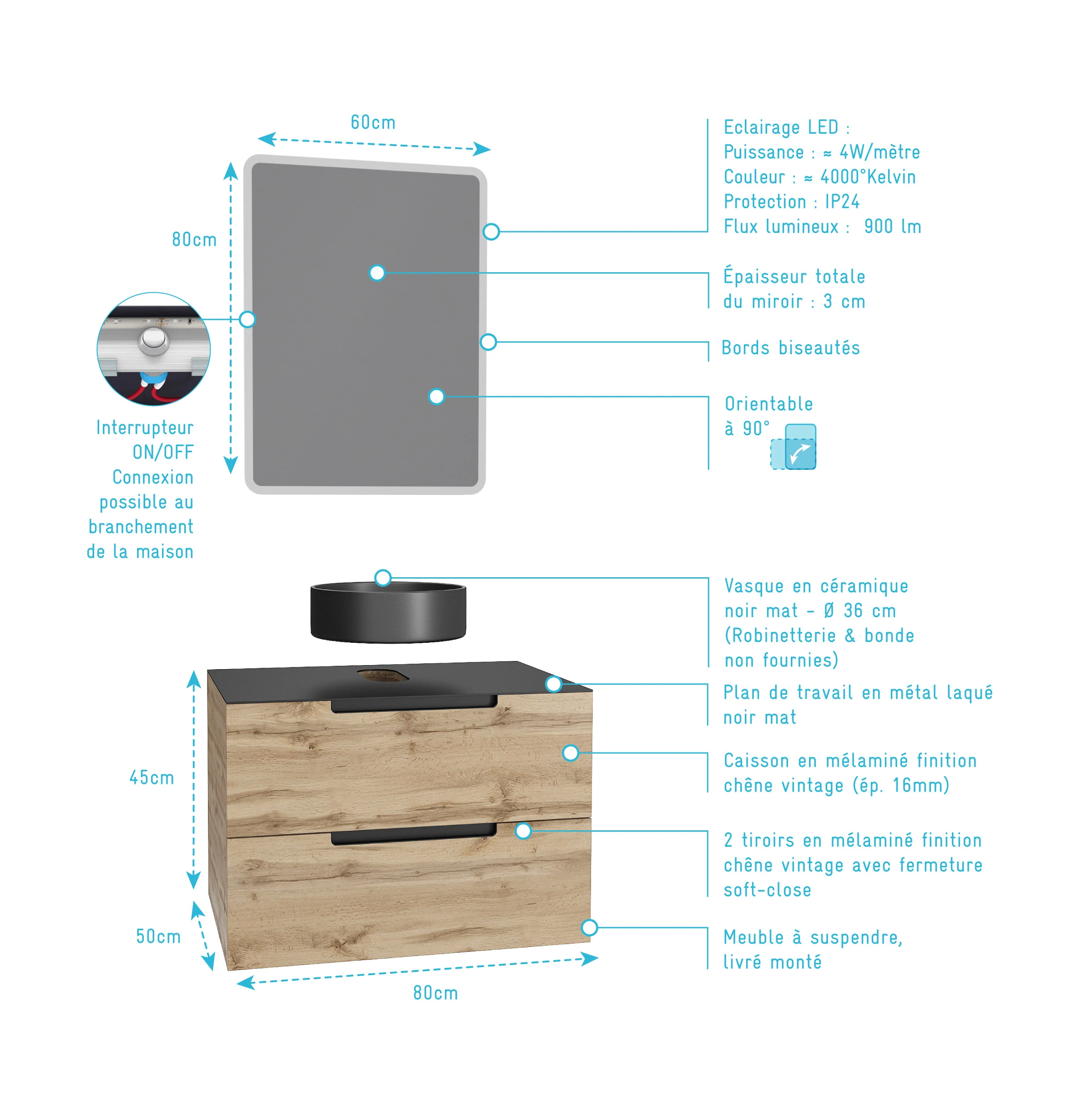 Meuble salle de bains 80 cm 2 tiroirs – Chêne et noir – Vasque ronde – Miroir Led – OMEGA