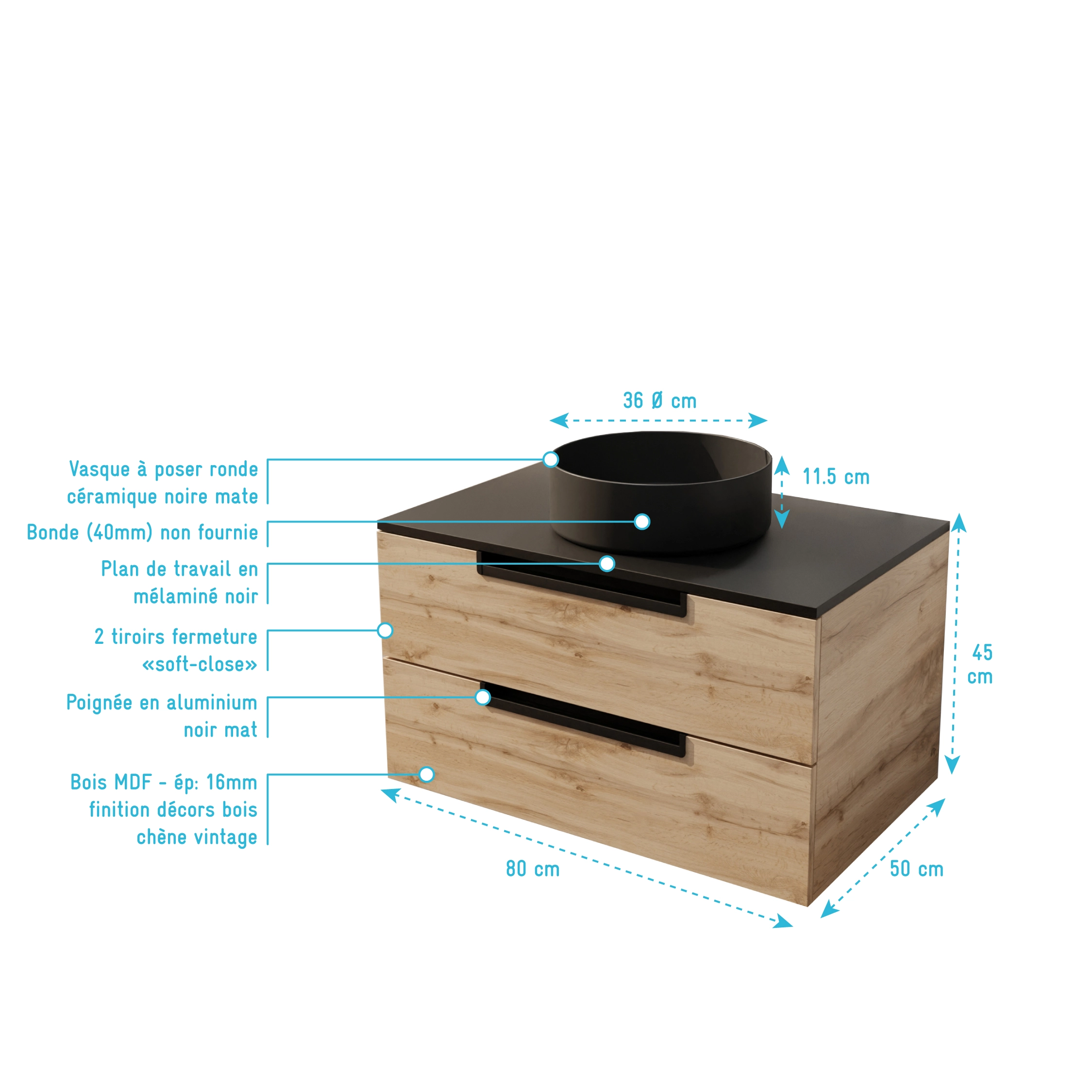 3 avis YUKI Meuble Salle de Bains 80cm 2 Tiroirs Décor Chêne et Noir Cranté - Vasque Blanche Mate - YUKI