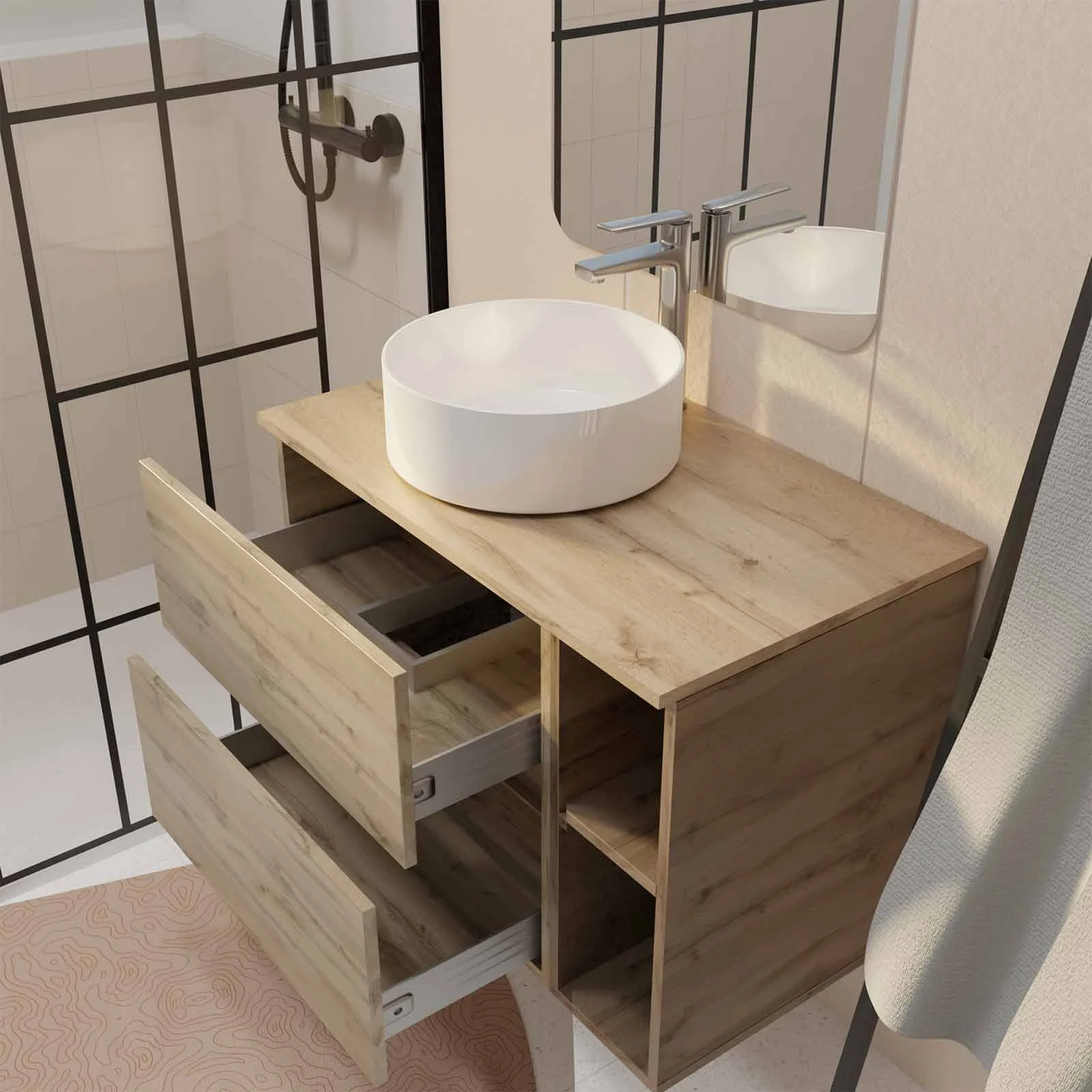Son plan de toilette de 80 cm vient sublimer l’ensemble et assurer une harmonie parfaite entre les éléments. Une vasque à poser en céramique blanche et un miroir complètent l’ensemble pour un effet déco affirmé, où le bois chaleureux contraste subtilement avec des touches de lumières.