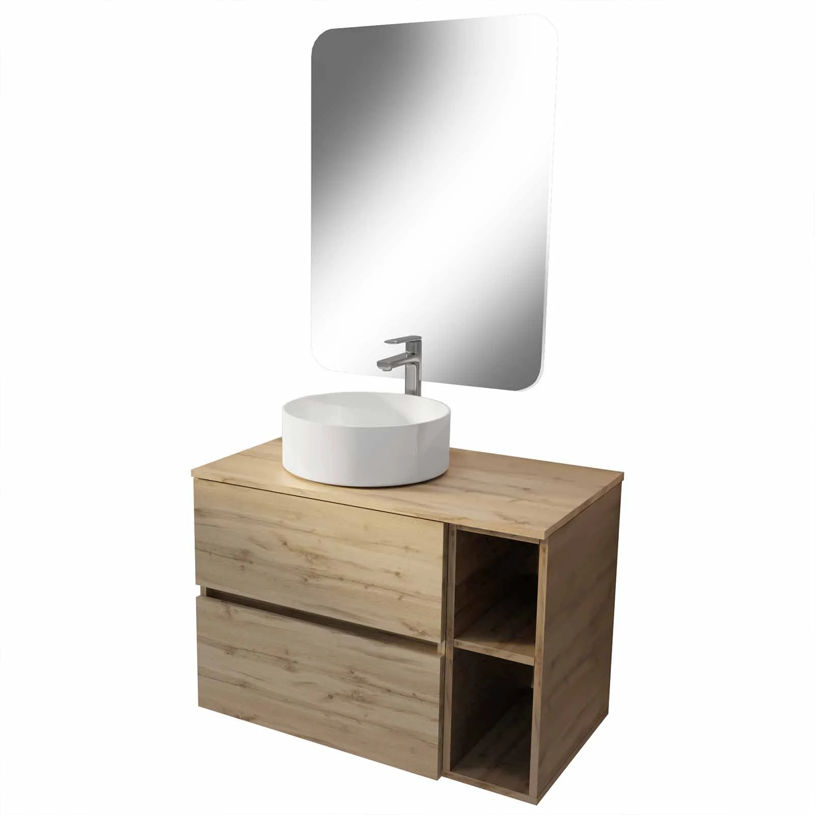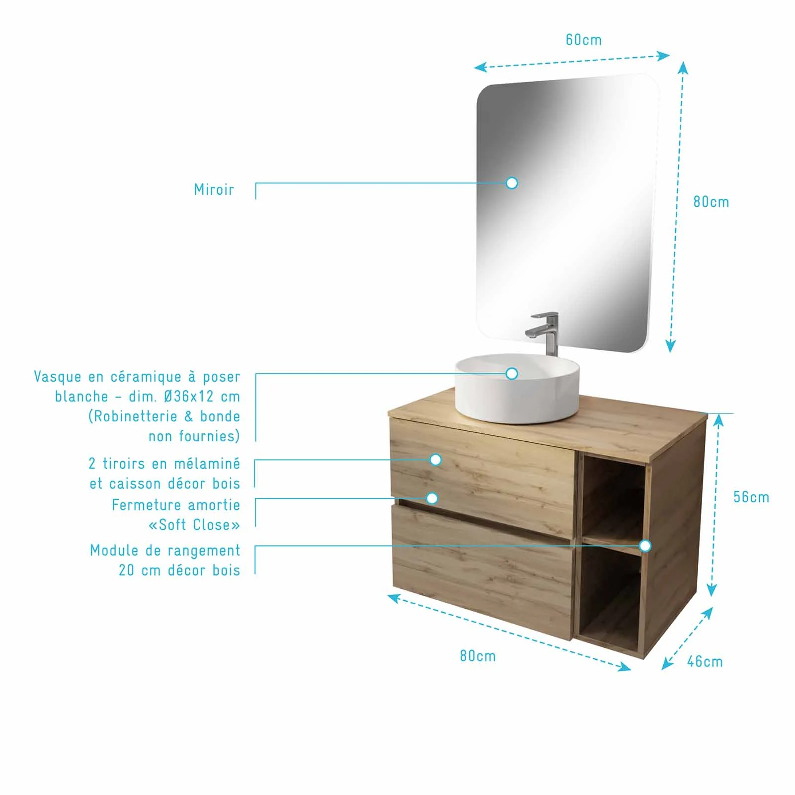 Meuble salle de bains 80 TIMBER Décor Chêne Tiroirs + Module – Vasque Blanche – Miroir 60×80
