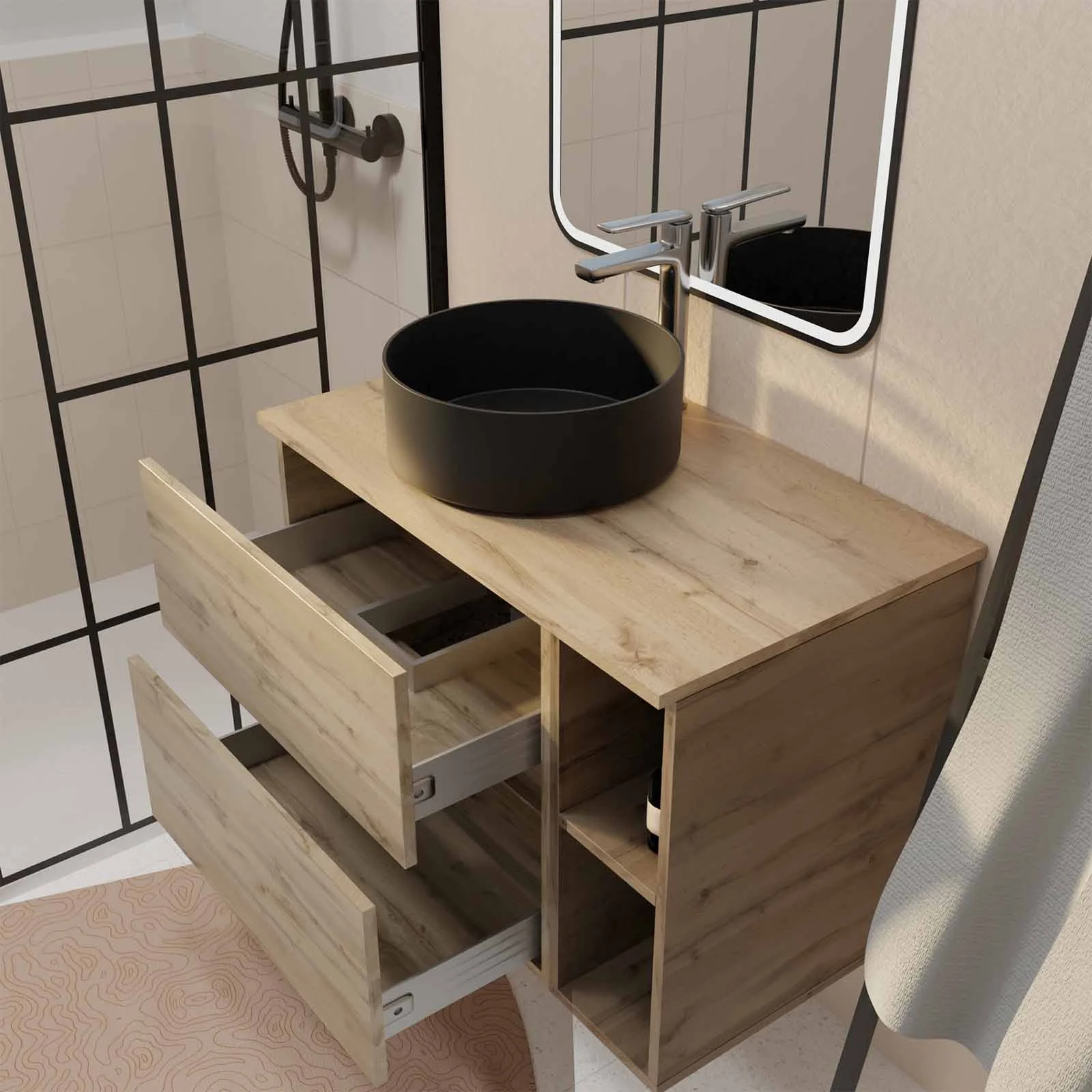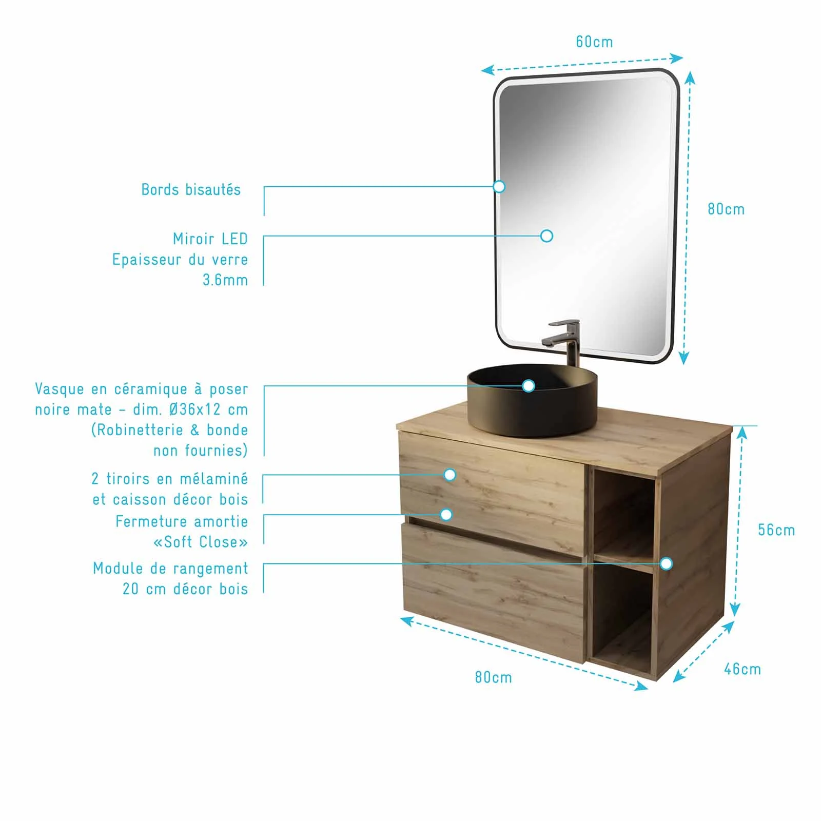 Son plan de toilette de 80 cm vient sublimer l’ensemble et assurer une harmonie parfaite entre les éléments. Une vasque à poser en céramique noire et un miroir avec éclairage LED 4W à bords dépolis biseautés et sérigraphiés noir mat complètent l’ensemble pour un effet déco affirmé, où le bois chaleureux contraste subtilement avec une touche sombre.