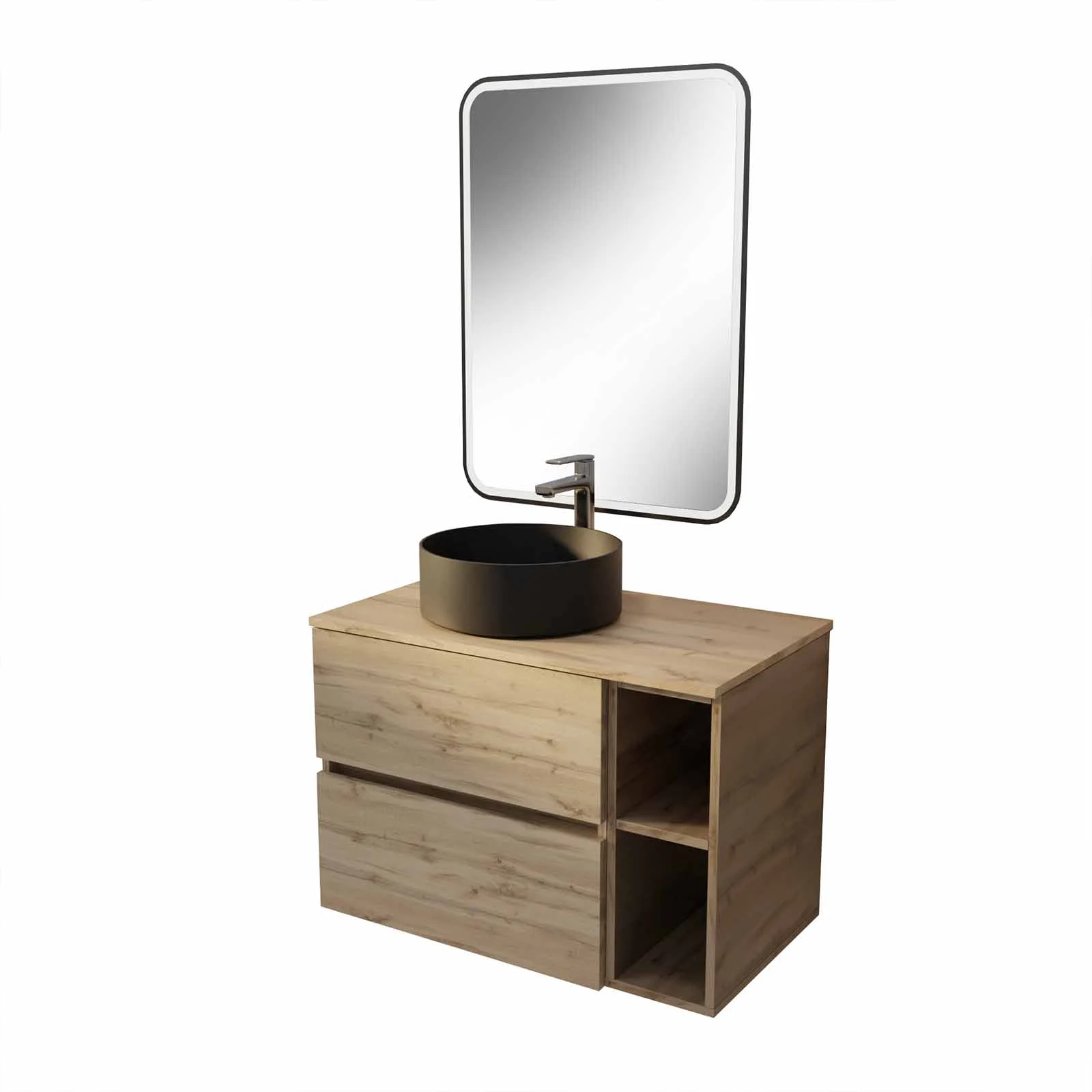 Meuble salle de bains 80 TIMBER Décor Chêne Tiroirs + Module – Vasque et Miroir 60×80 LED bord Noir