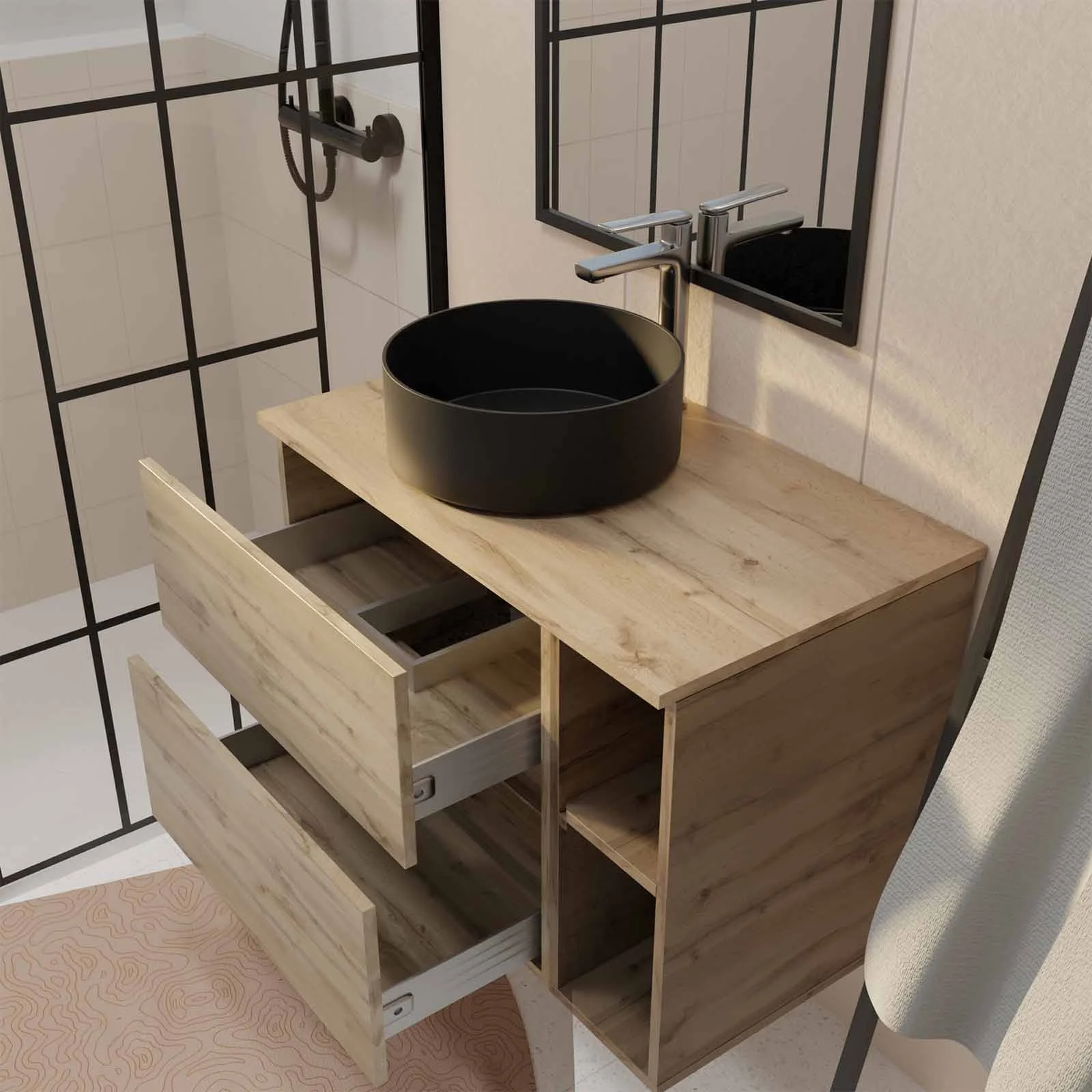 Son plan de toilette de 80 cm vient sublimer l’ensemble et assurer une harmonie parfaite entre les éléments. Une vasque à poser en céramique noire et un miroir avec un encadrement noir complètent l’ensemble pour un effet déco affirmé, où le bois chaleureux contraste subtilement avec une touche sombre.
