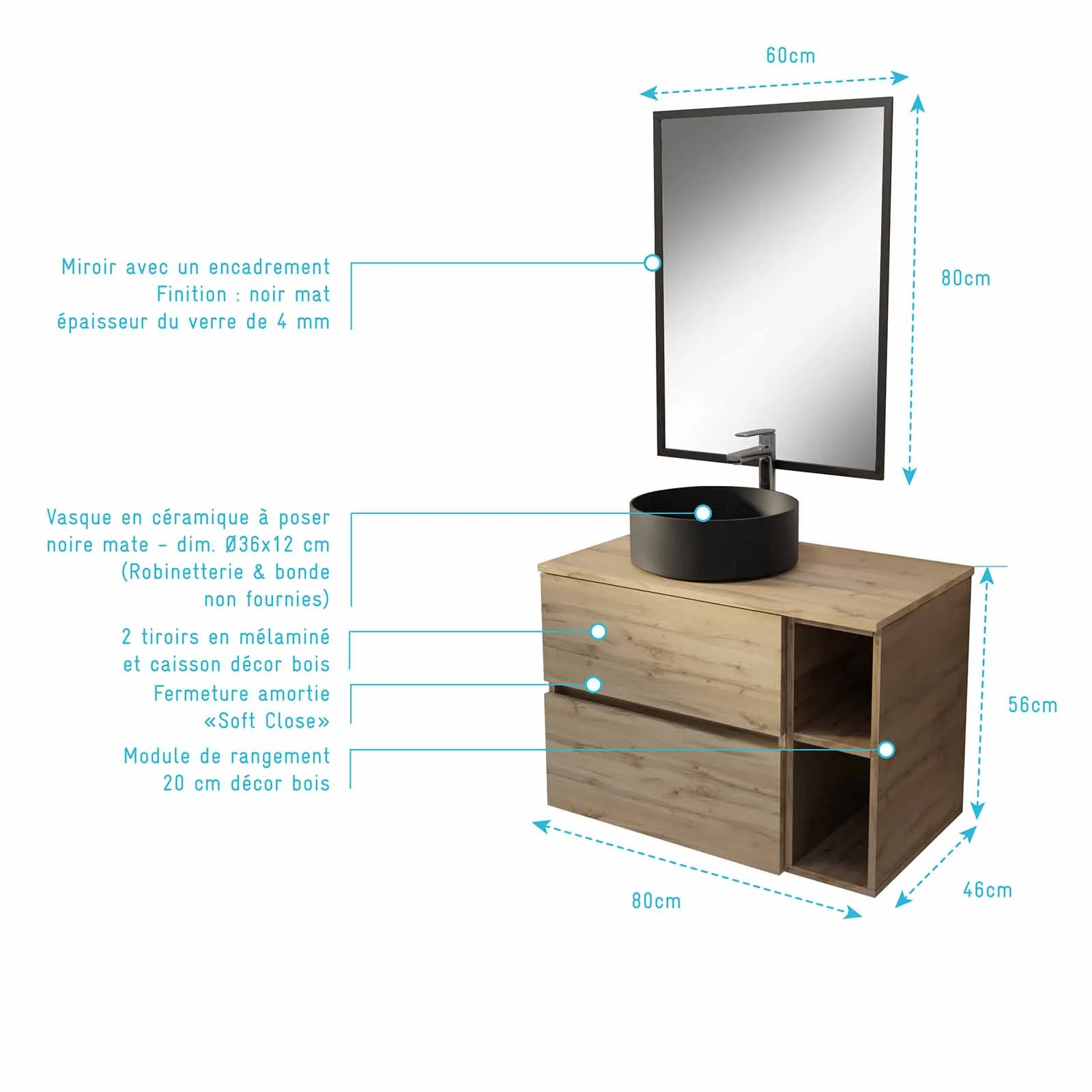 Meuble salle de bains 80 TIMBER Décor Chêne Tiroirs + Module – Vasque Noire – Miroir Bords Noirs
