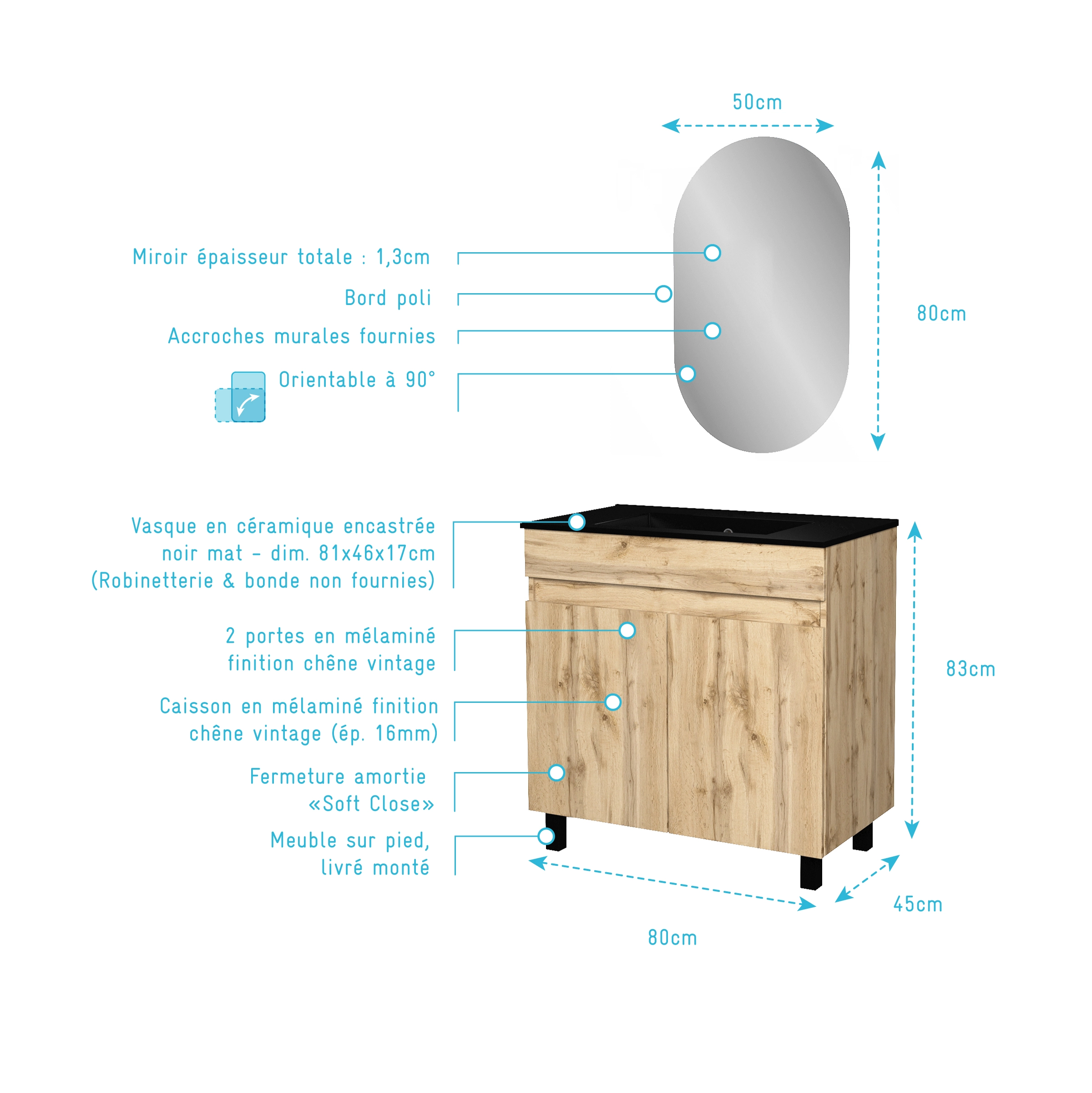 1 avis YUKI Meuble Salle de Bains YUKI 80 2 Tiroirs Décor Chêne et Noir - Vasque Blanche - Miroir Ovale 50x80