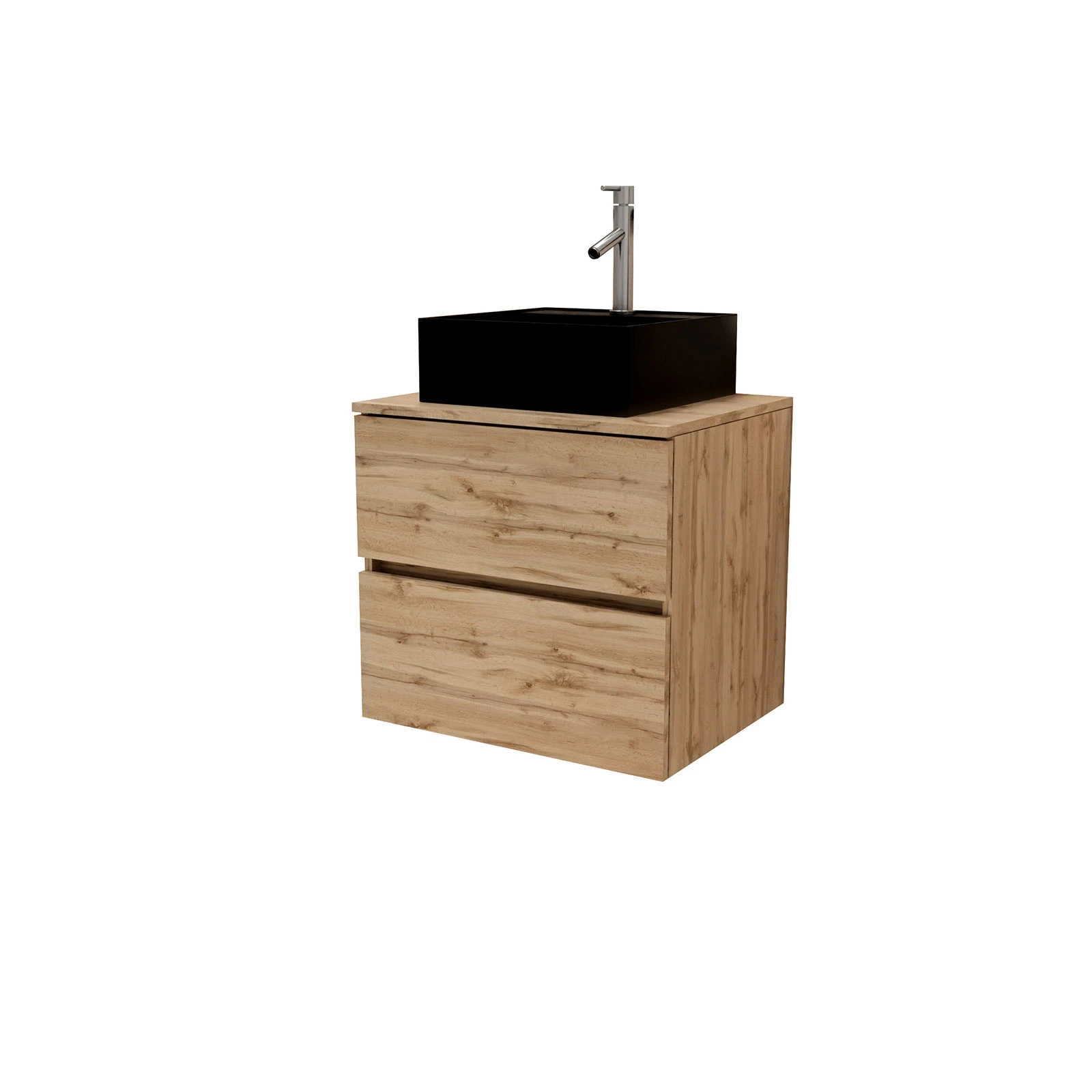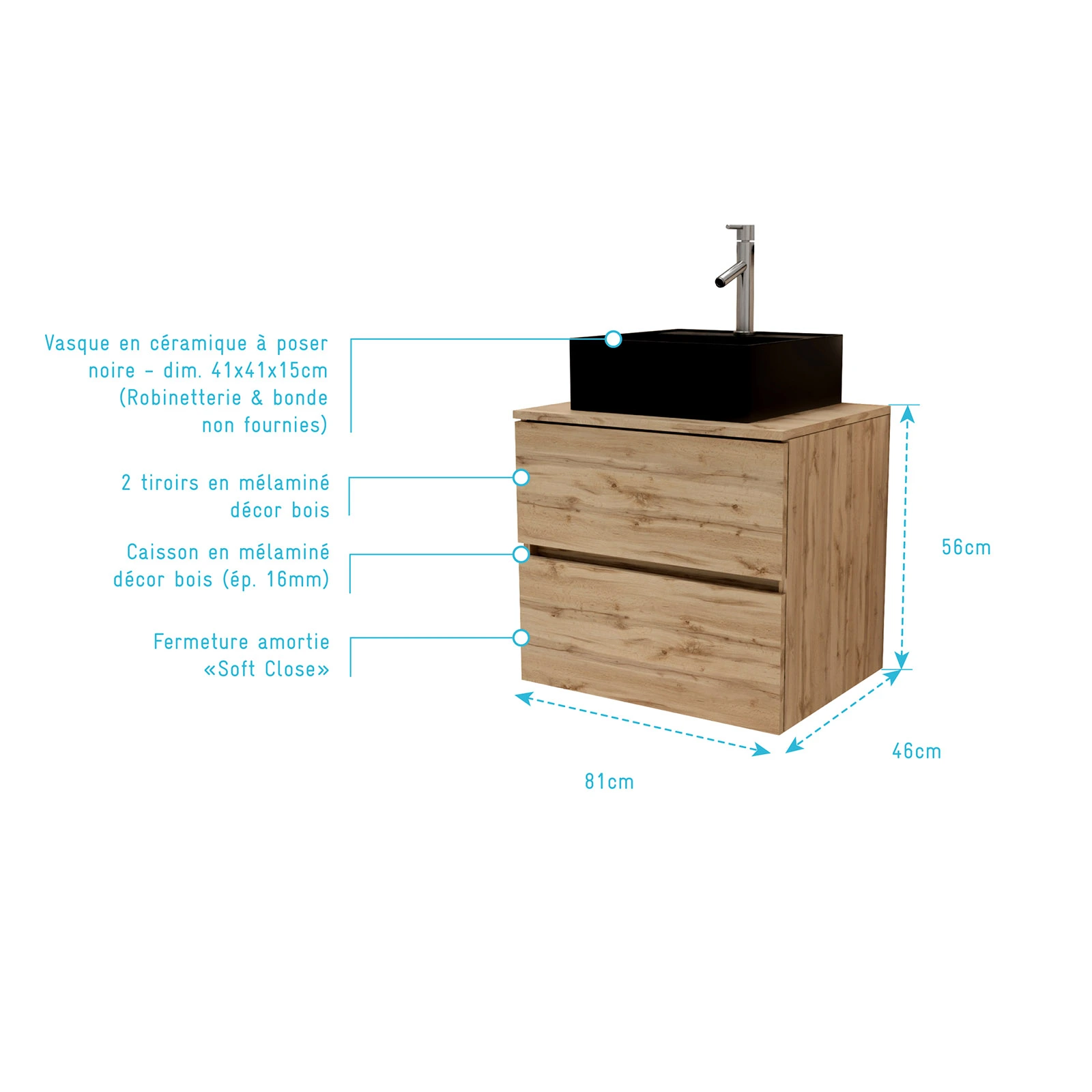 Meuble Salle de Bains 80cm 2 Tiroirs Chêne Naturel + Vasque Carrée 41x41x15cm en Céramique Noire