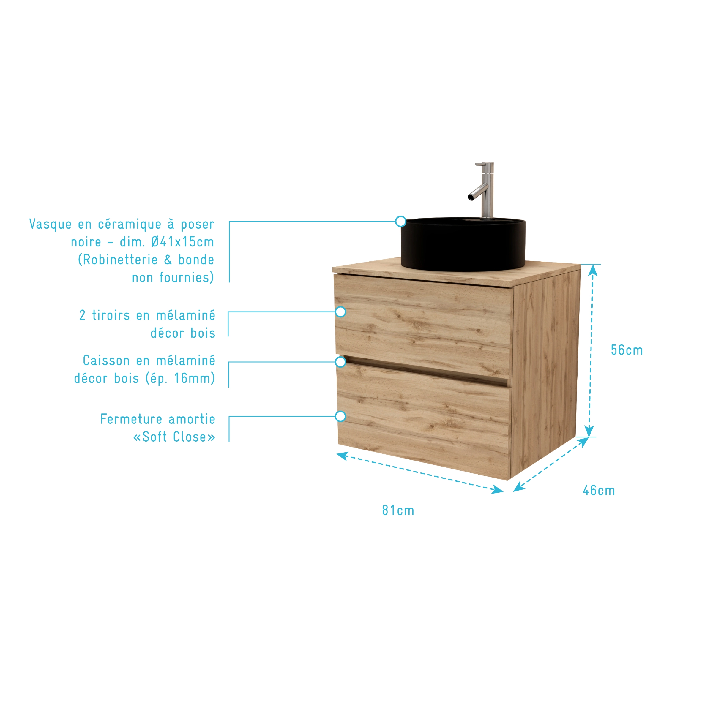 Meuble Salle de Bains 80cm 2 Tiroirs Chêne Naturel + Vasque Ronde Diamètre 41cm en Céramique Noire