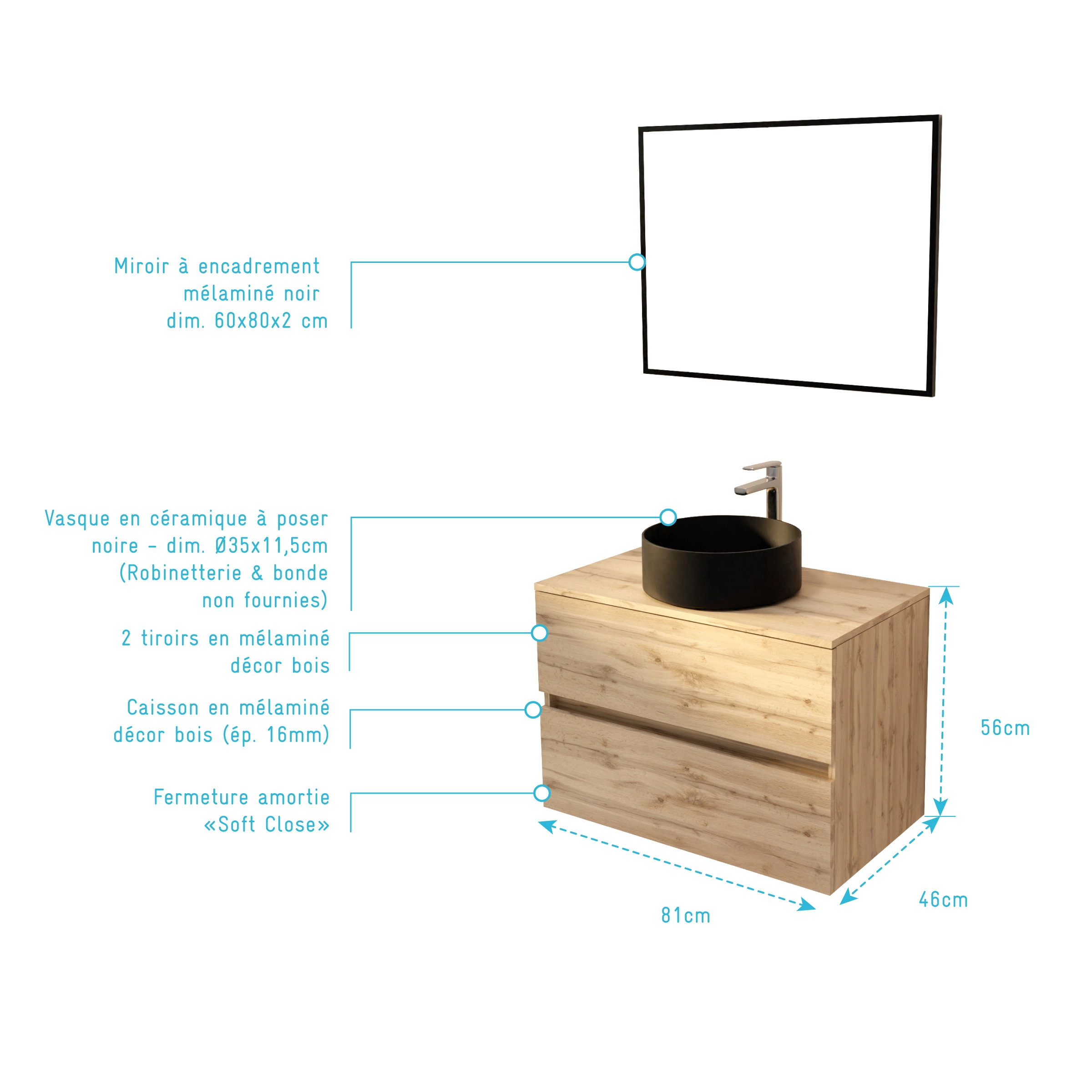 • Meuble Salle de Bains 80cm 2 Tiroirs Chêne Naturel + Vasque Ronde Noire 36cm et Miroir 60x80cm