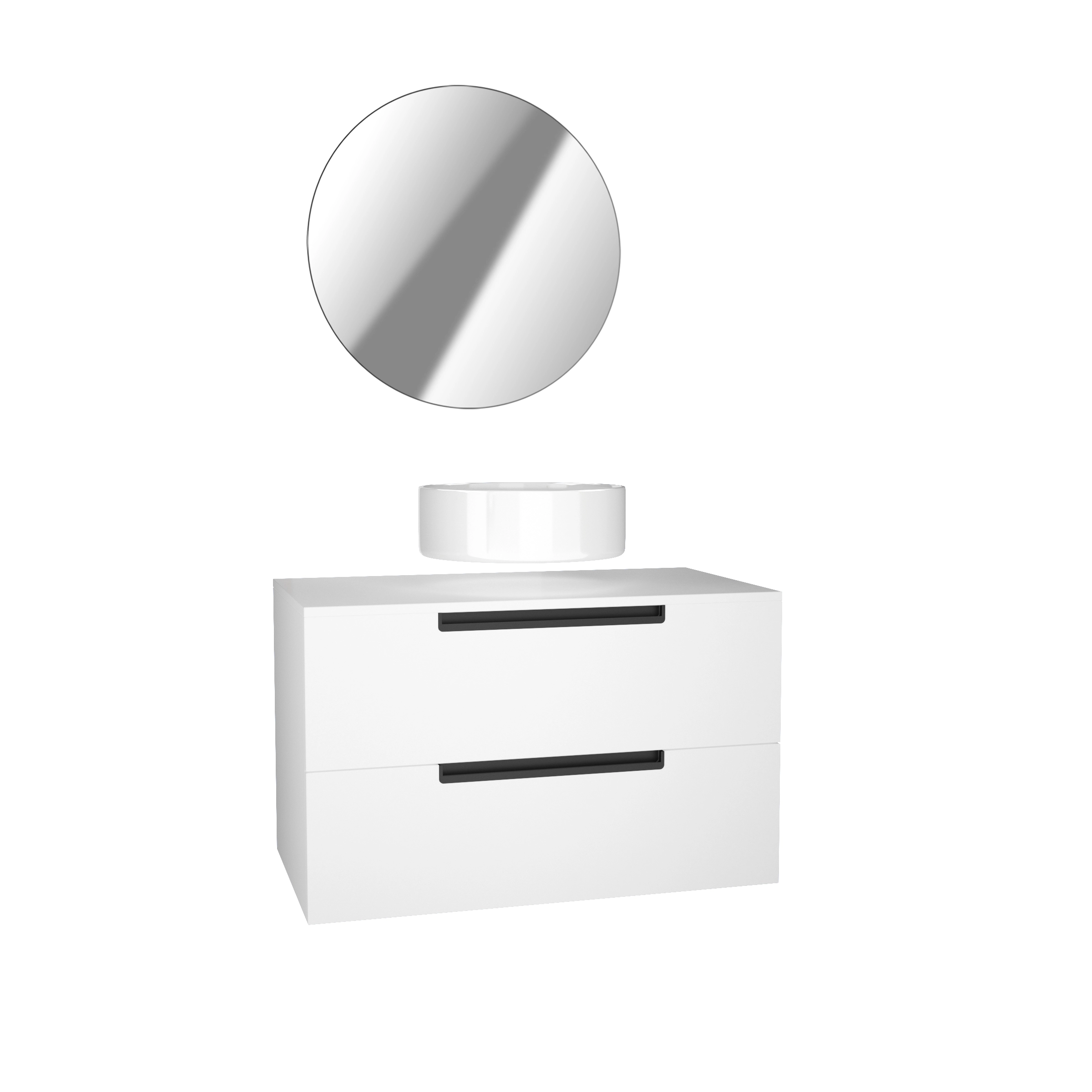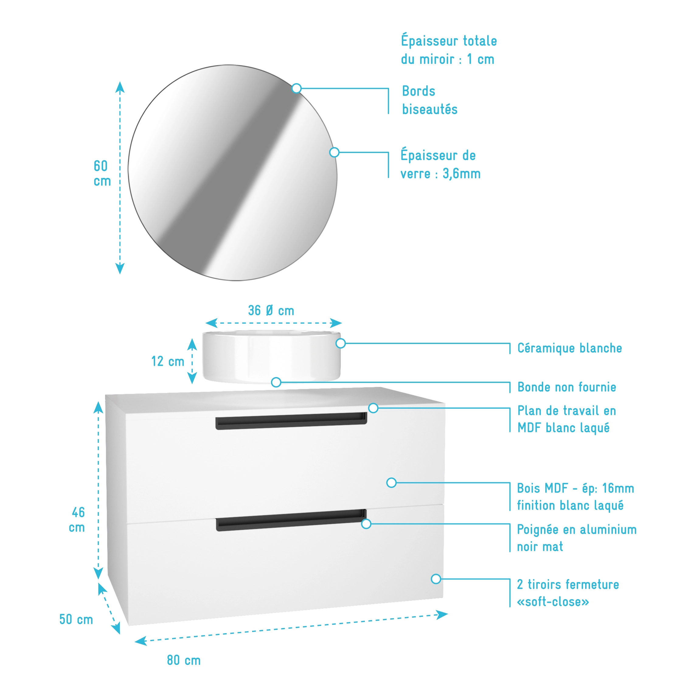 Meuble salle de bains 80cm Blanc Laque 2 tiroirs – Vasque Blanche 36cm et Miroir Rond 60cm