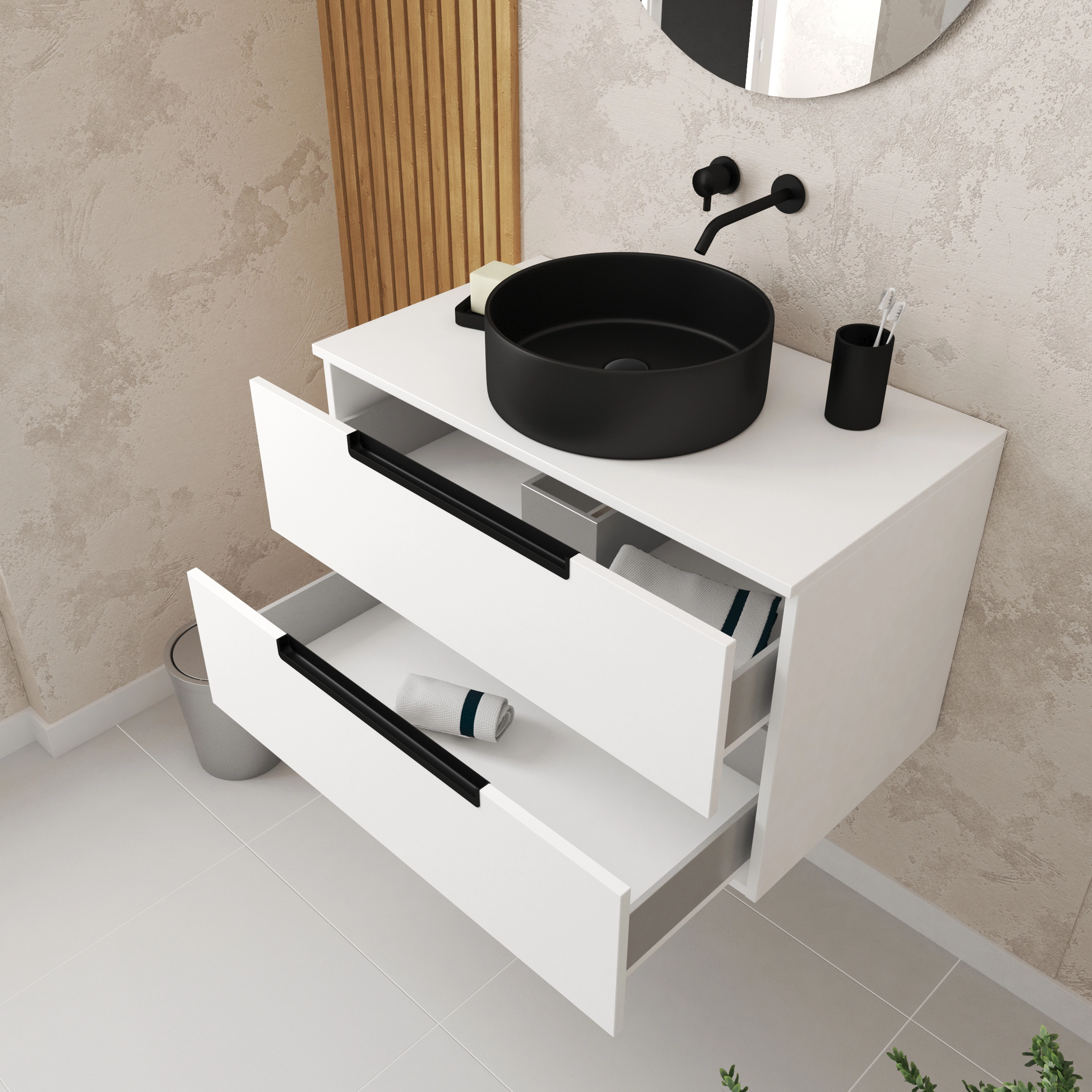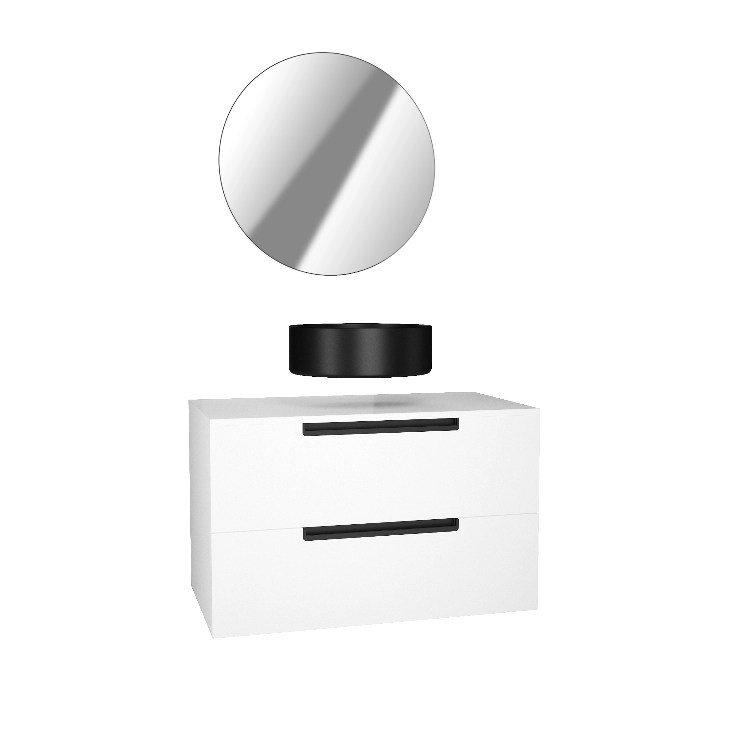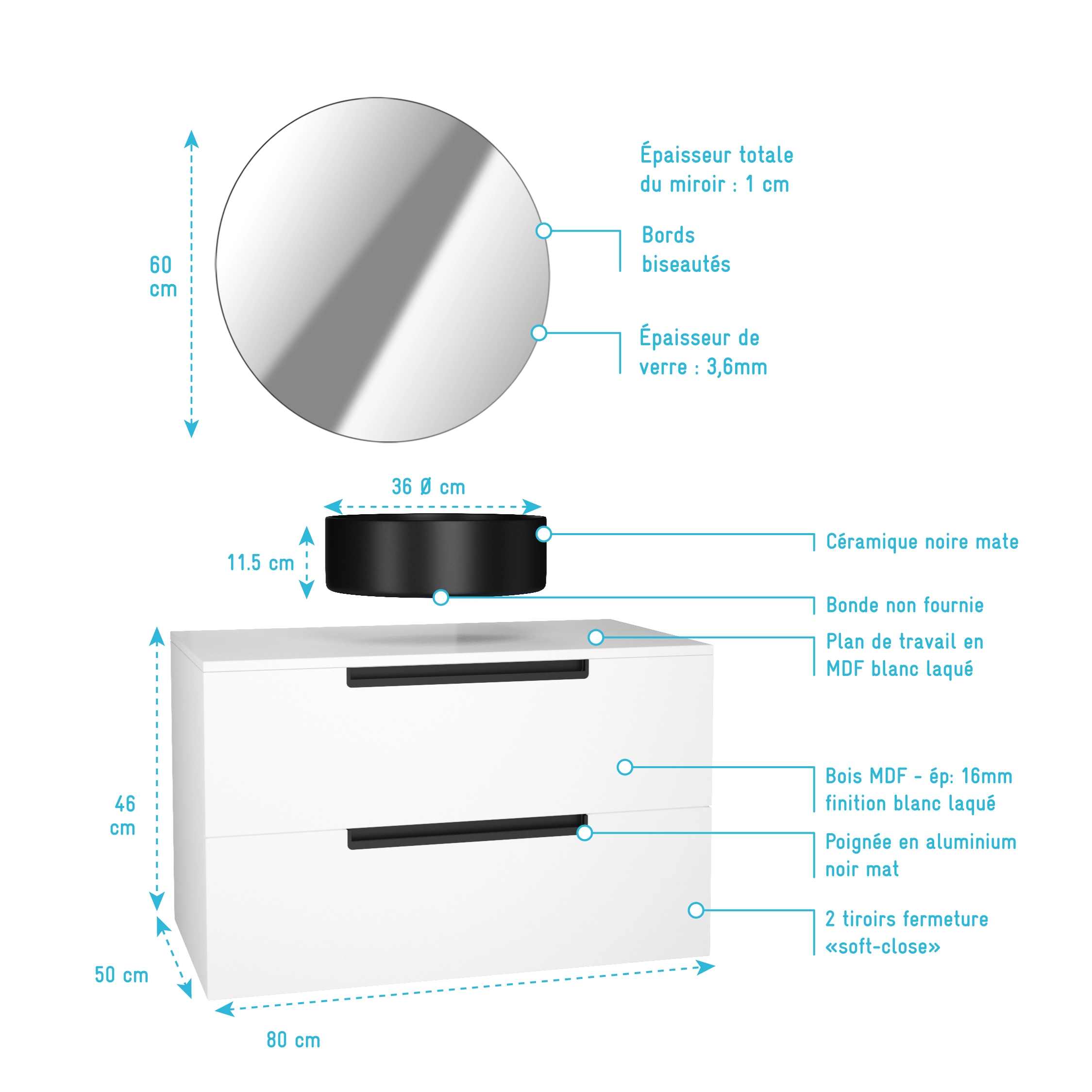 Meuble salle de bains 80cm Blanc Laque 2 tiroirs – Vasque Noire 36cm et Miroir Rond 60cm