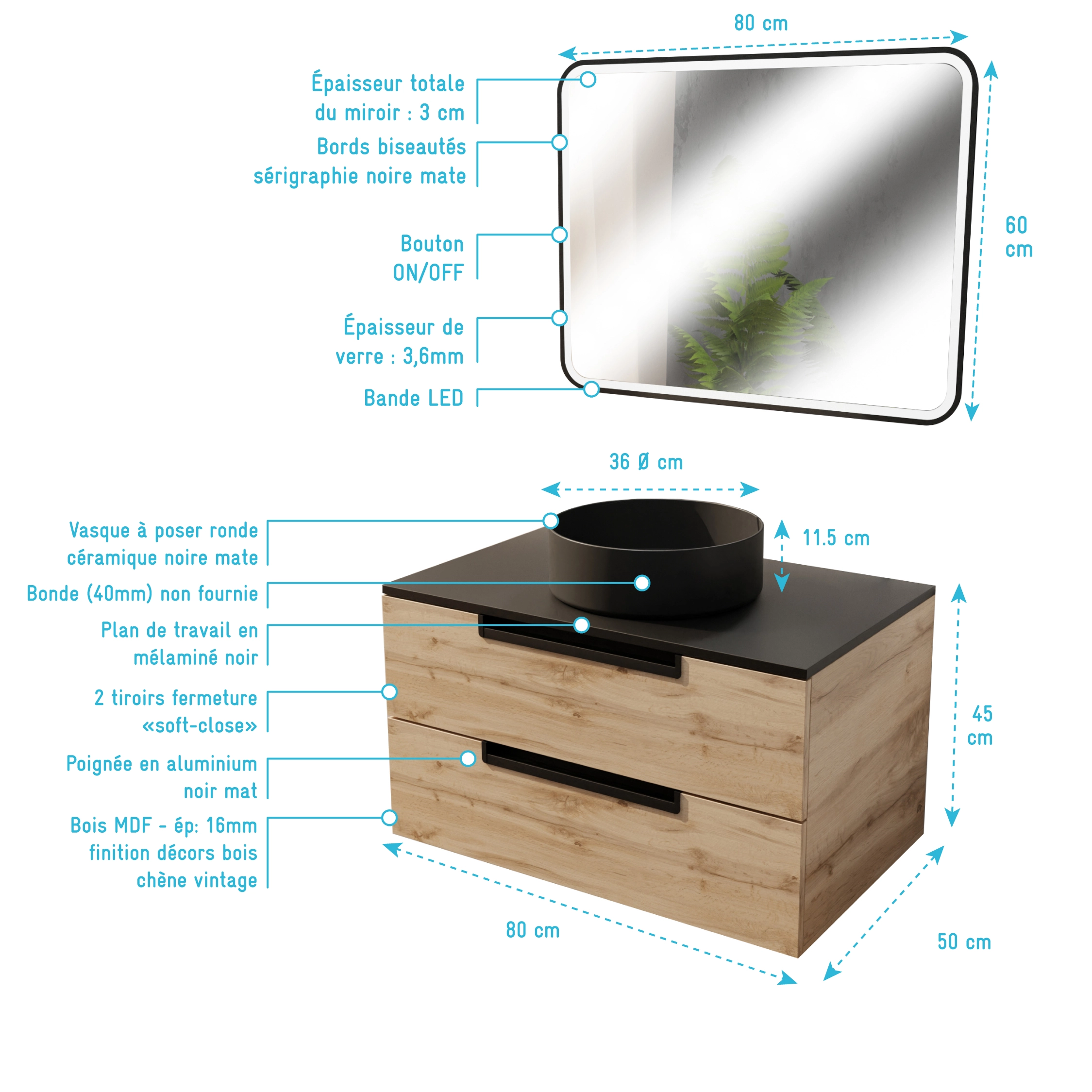 0 avis YUKI Meuble Salle de Bains YUKI 80 - 2 Tiroirs Décor Chêne et Noir - Vasque Blanche - Miroir LED 70