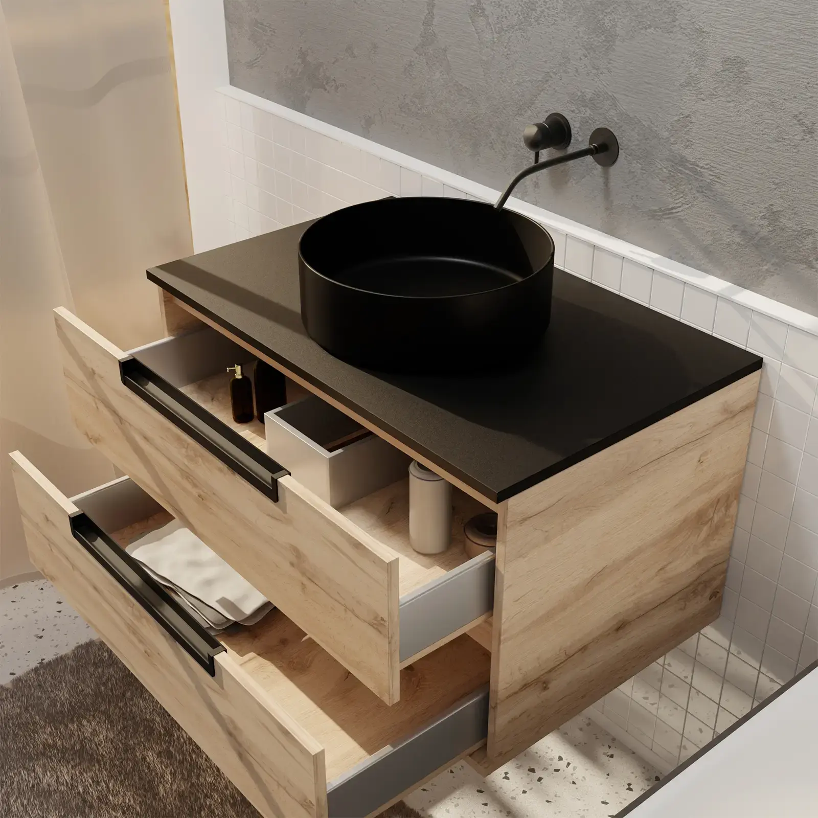 Les poignées en aluminium noir mat ajoutent une touche de sophistication, tandis que les tiroirs offrent un rangement généreux et organisé.