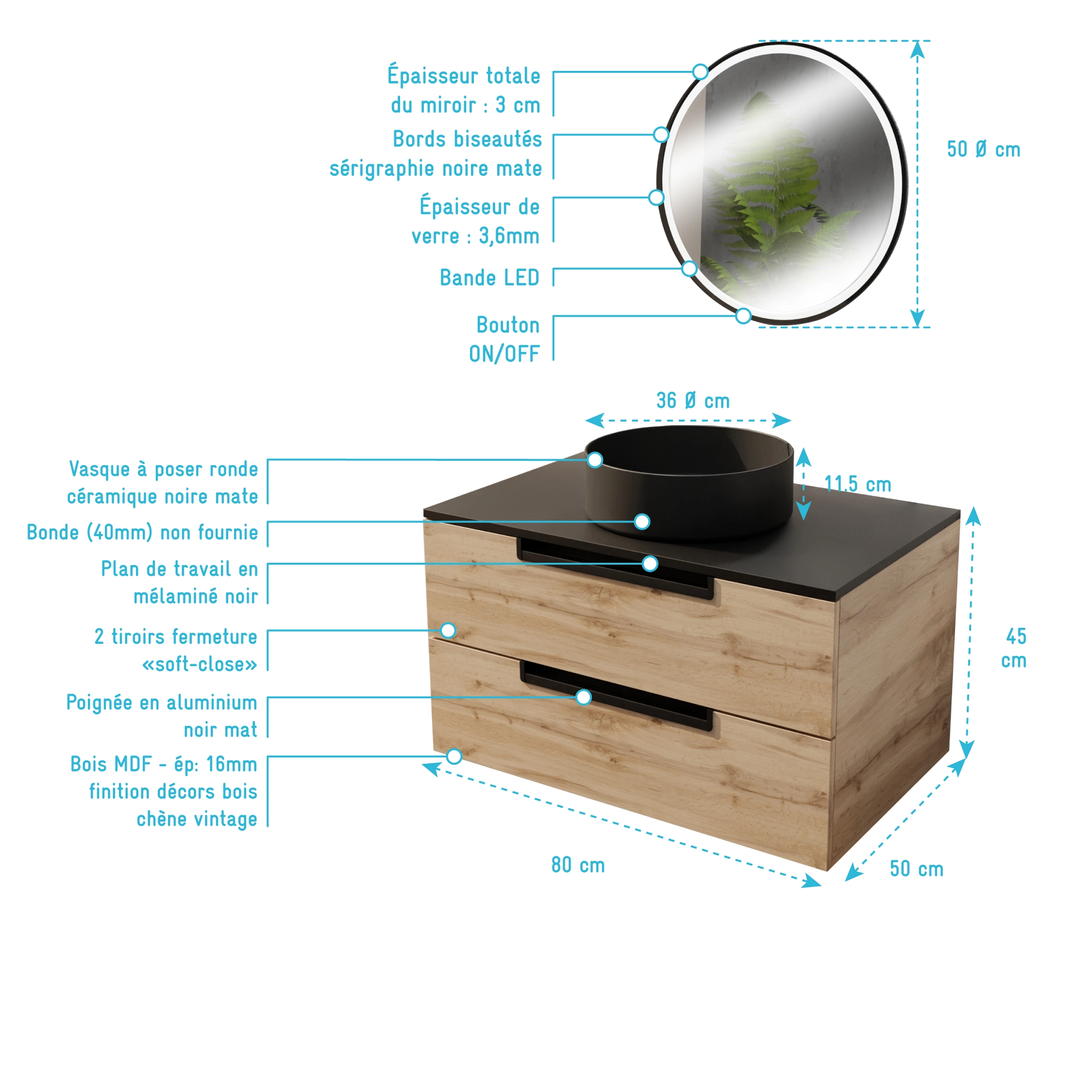 Meuble salle de bains 80cm Decor Bois et Noir, 2 Tiroirs, Vasque Noire 36cm et Miroir Led 50cm