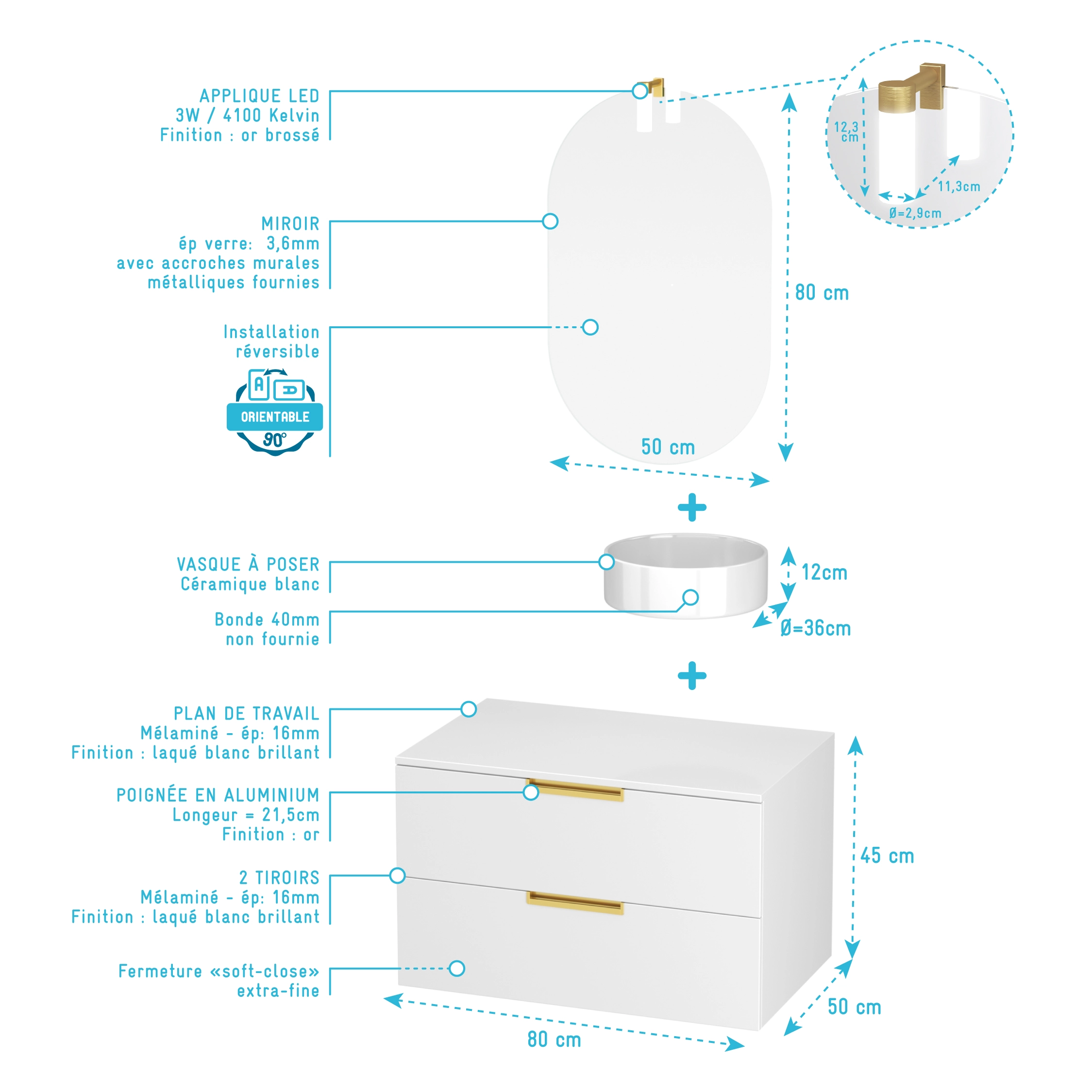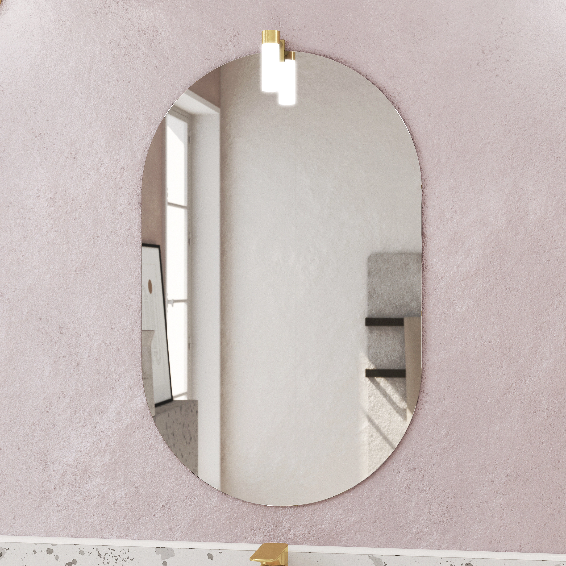 Le miroir ovale et son applique LED à la finition doré brossé vient compléter l’ensemble.