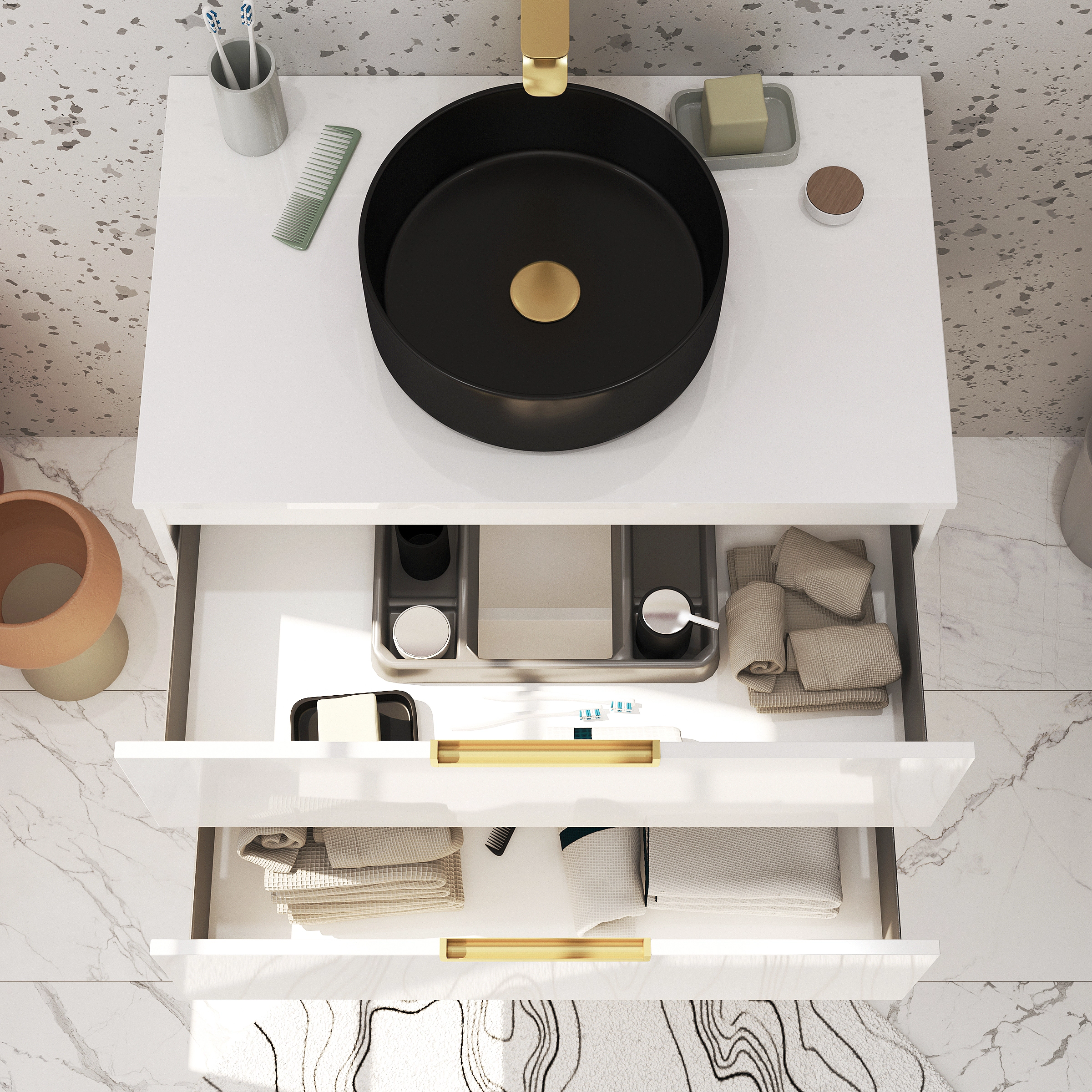 Moderne et décoratif, le meuble de salle de bains suspendu JAZZY GOLD au 2 tiroirs à fermeture progressive « Soft-Close » ajoutera un air sophistiqué et élégant à votre pièce grâce à ses poignées dorées. Vous craquerez pour ses finitions soignées et son touché doux. Le meuble est fabriqué au Portugal et il est certifié PEFC.