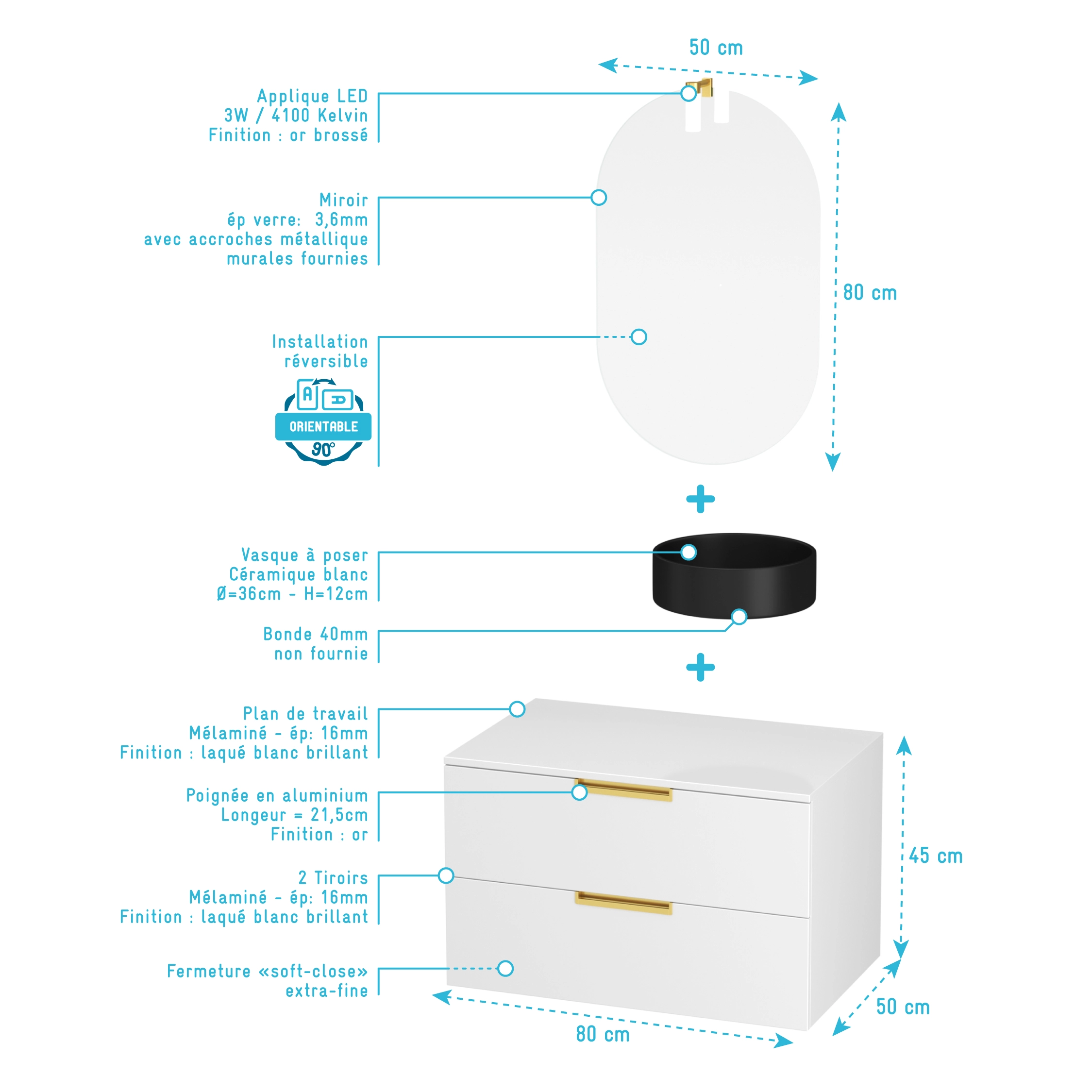Le miroir ovale et son applique LED à la finition doré brossé vient compléter l’ensemble.