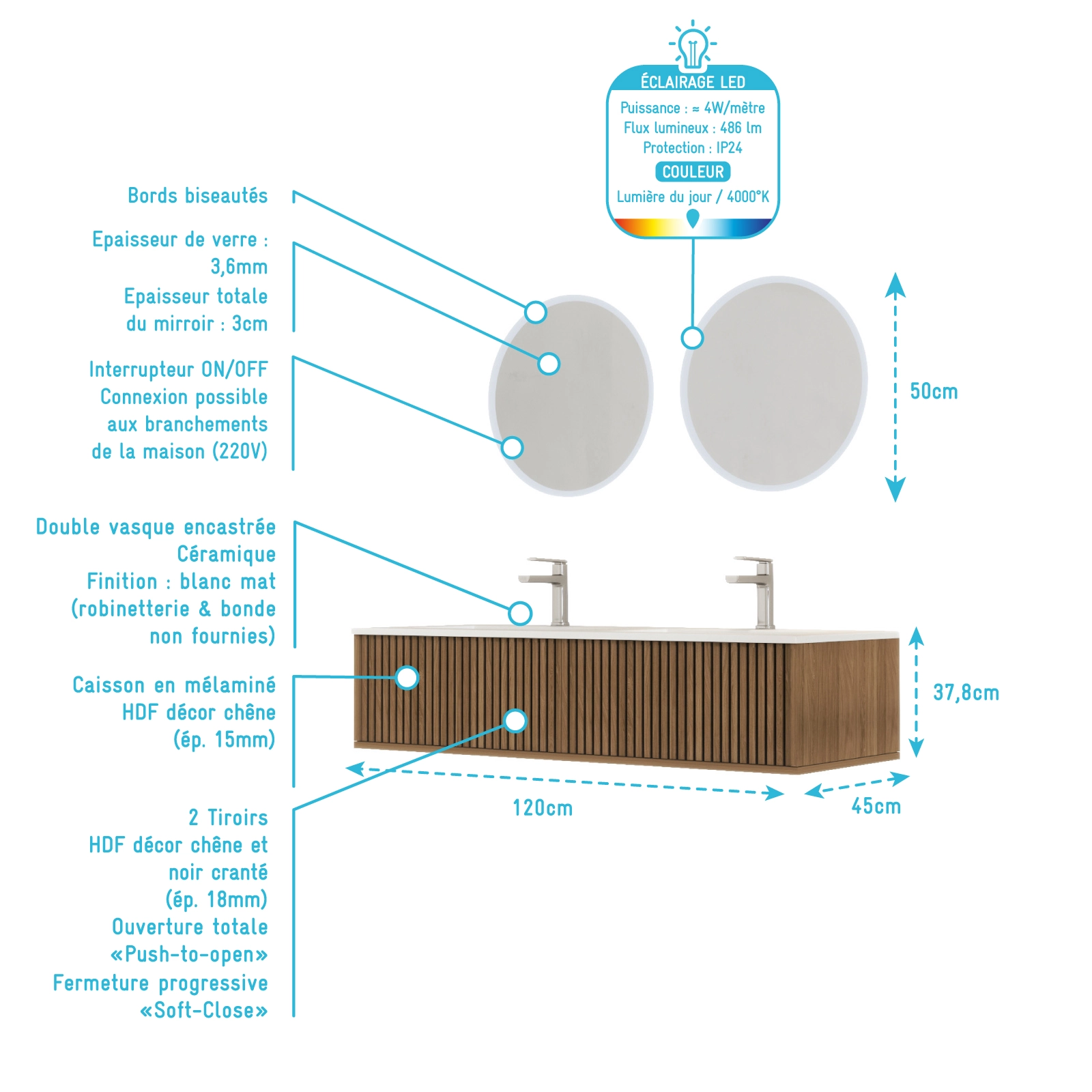 Meuble Salle de Bains YUKI 120 – 2 Tiroirs Décor Chêne et Noir – Vasque Blanche – Miroirs LED 50