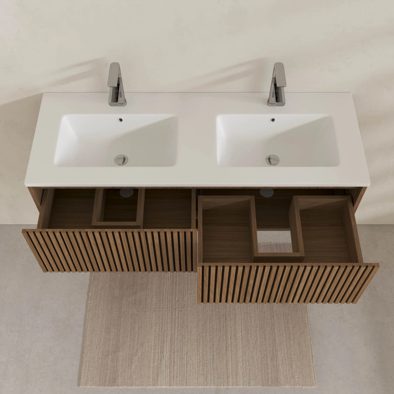 Plongez dans l’univers Japandi avec cette composition. Alliance subtile du raffinement japonais et de la douceur scandinave. Sa façade crantée bicolore bois et noir profond joue sur les reliefs pour apporter une forte présence déco à votre salle de bains, tout en conservant une esthétique épurée.