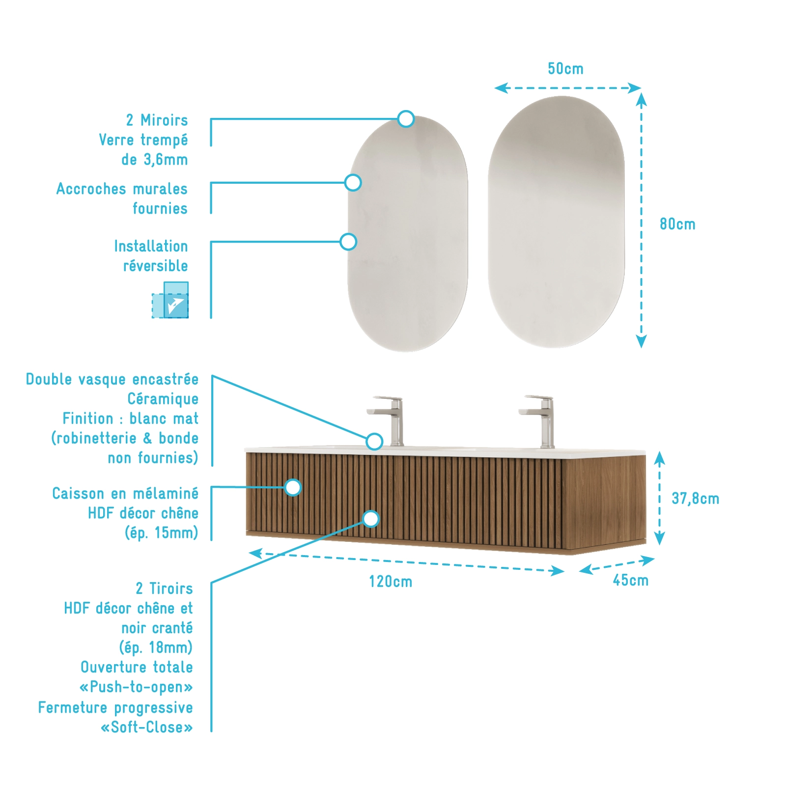 Meuble Salle de Bains YUKI 120 2 Tiroirs Décor Chêne et Noir – Vasque Blanche – Miroirs Ovales 50×80