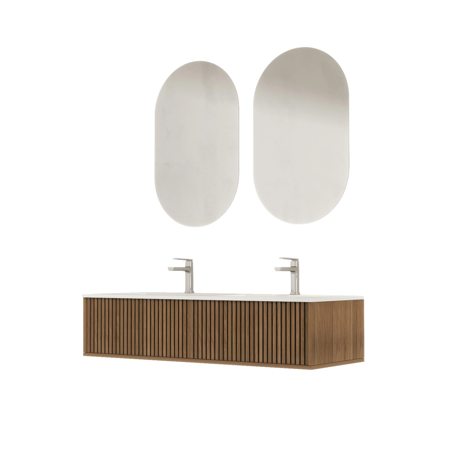 Sa double vasque encastrée en céramique blanche mate, ainsi que les miroirs ovales subliment les lignes du meuble.