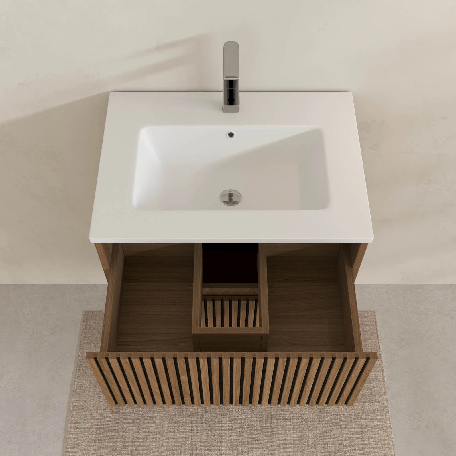 Plongez dans l’univers Japandi avec cette composition. Alliance subtile du raffinement japonais et de la douceur scandinave. Sa façade crantée bicolore bois et noir profond joue sur les reliefs pour apporter une forte présence déco à votre salle de bains, tout en conservant une esthétique épurée.