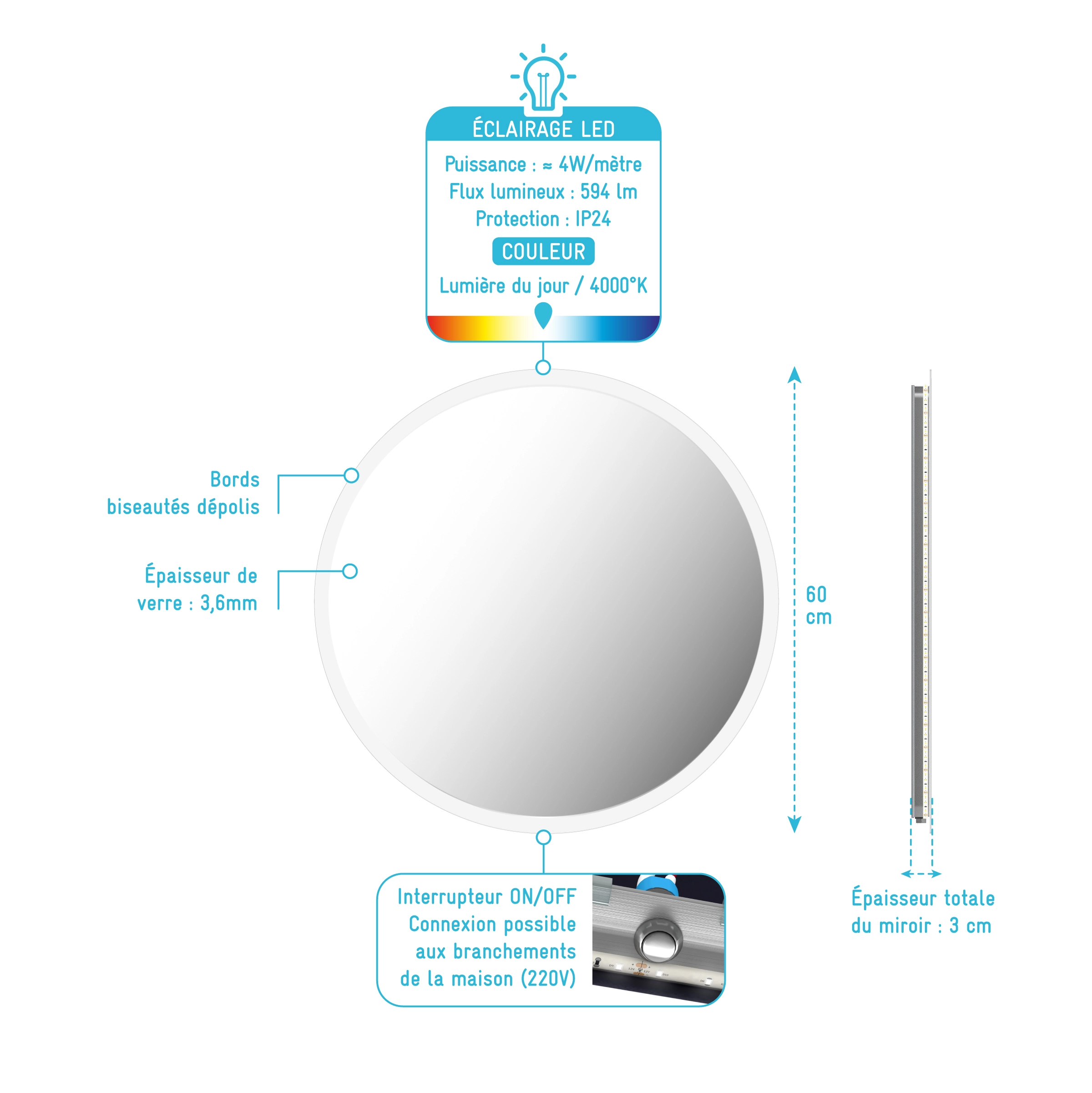 Miroir salle de bain rond avec eclairage LED – Diamètre 60cm – GO LED