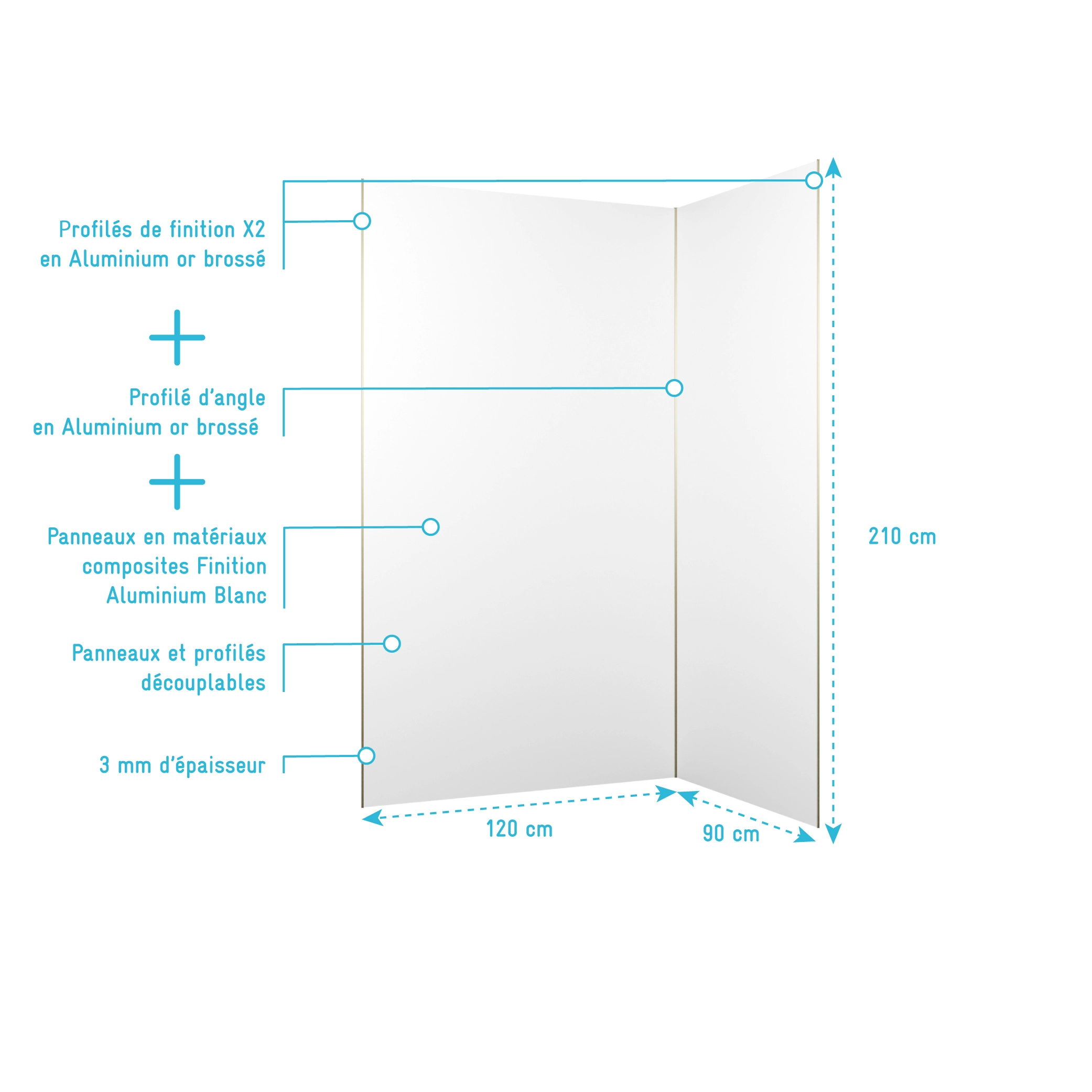 Pack 2 Panneaux Muraux en Aluminium Blanc 120+90×210 cm + Profilés Finition et Angle Or Doré Brossé