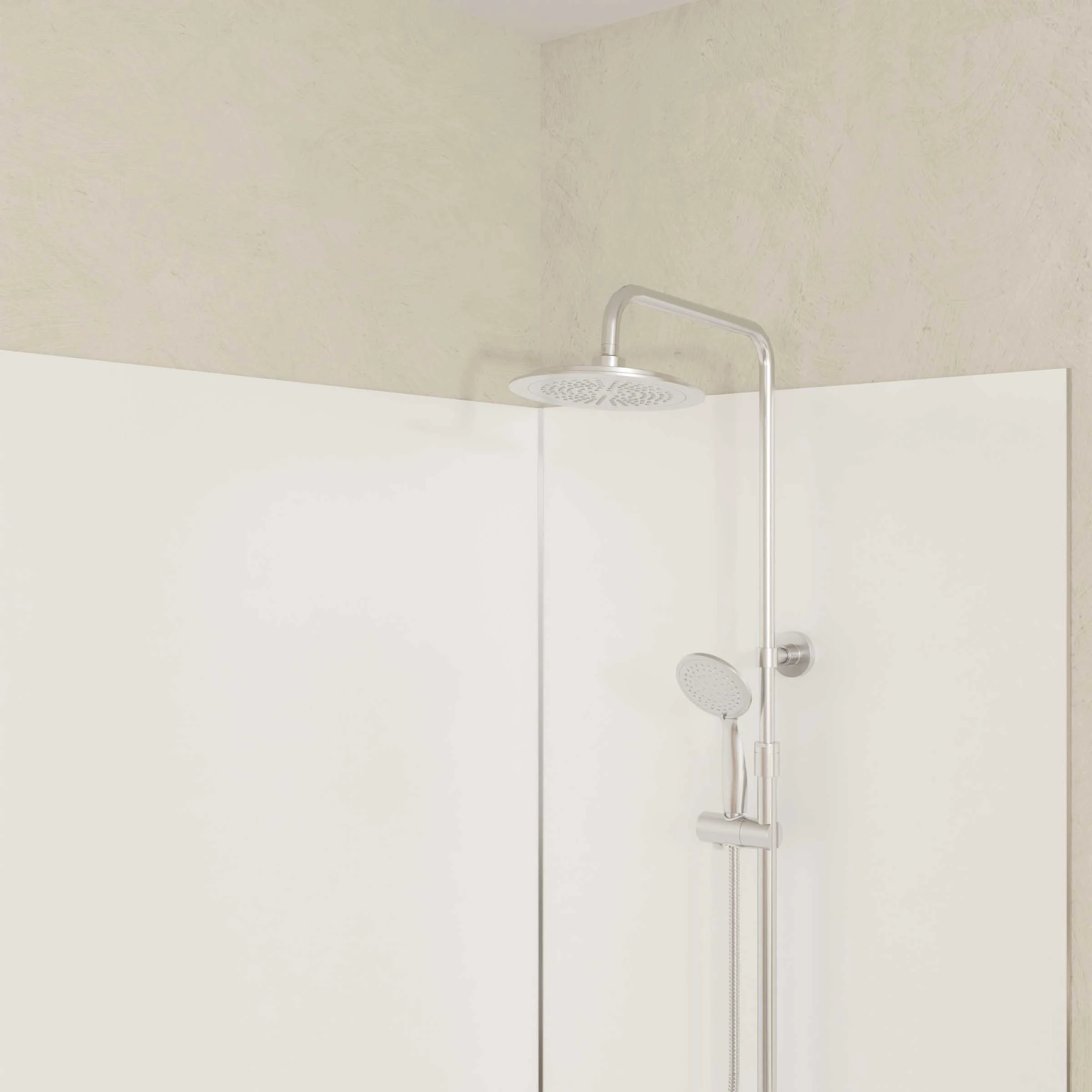 Les panneaux muraux doivent être collés à l’aide de mastic PU ou de silicone pour garantir le maintien et l’étanchéité de votre douche. Des bandes de scotch double face permettent de maintenir le panneau le temps du séchage de la colle.
