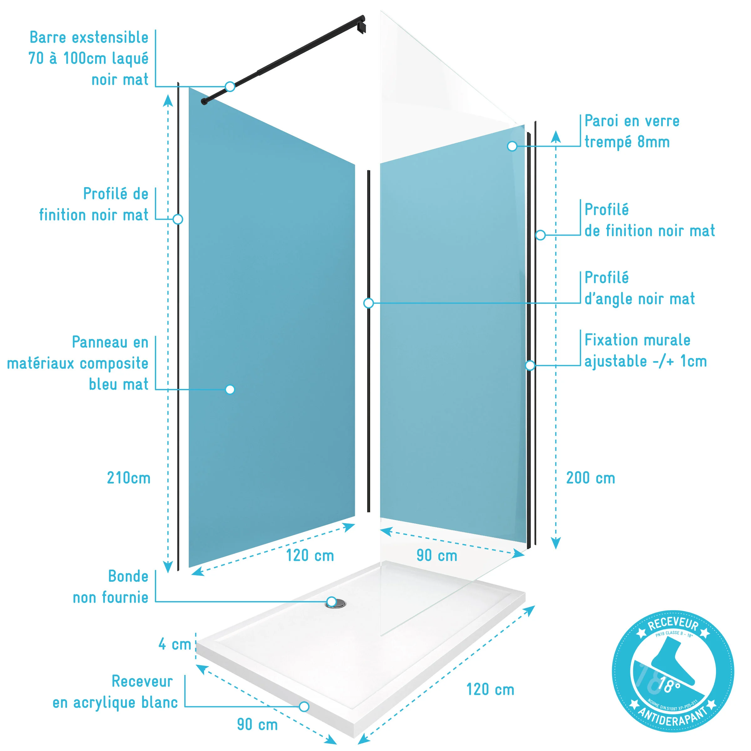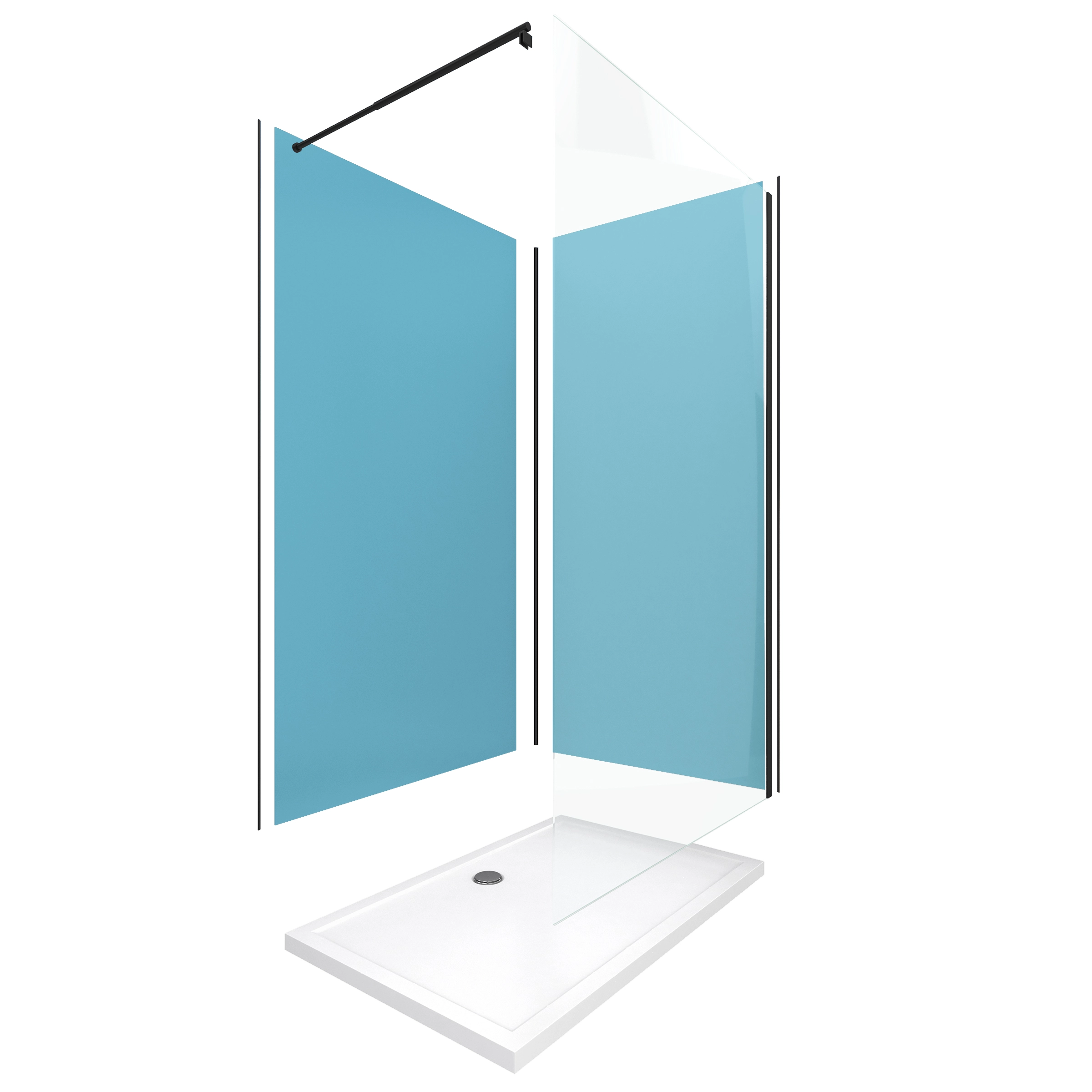 Pack Douche à l’Italienne 90×120 – Kit Panneaux Muraux Bleu/Noir + Receveur + Paroi Transparente