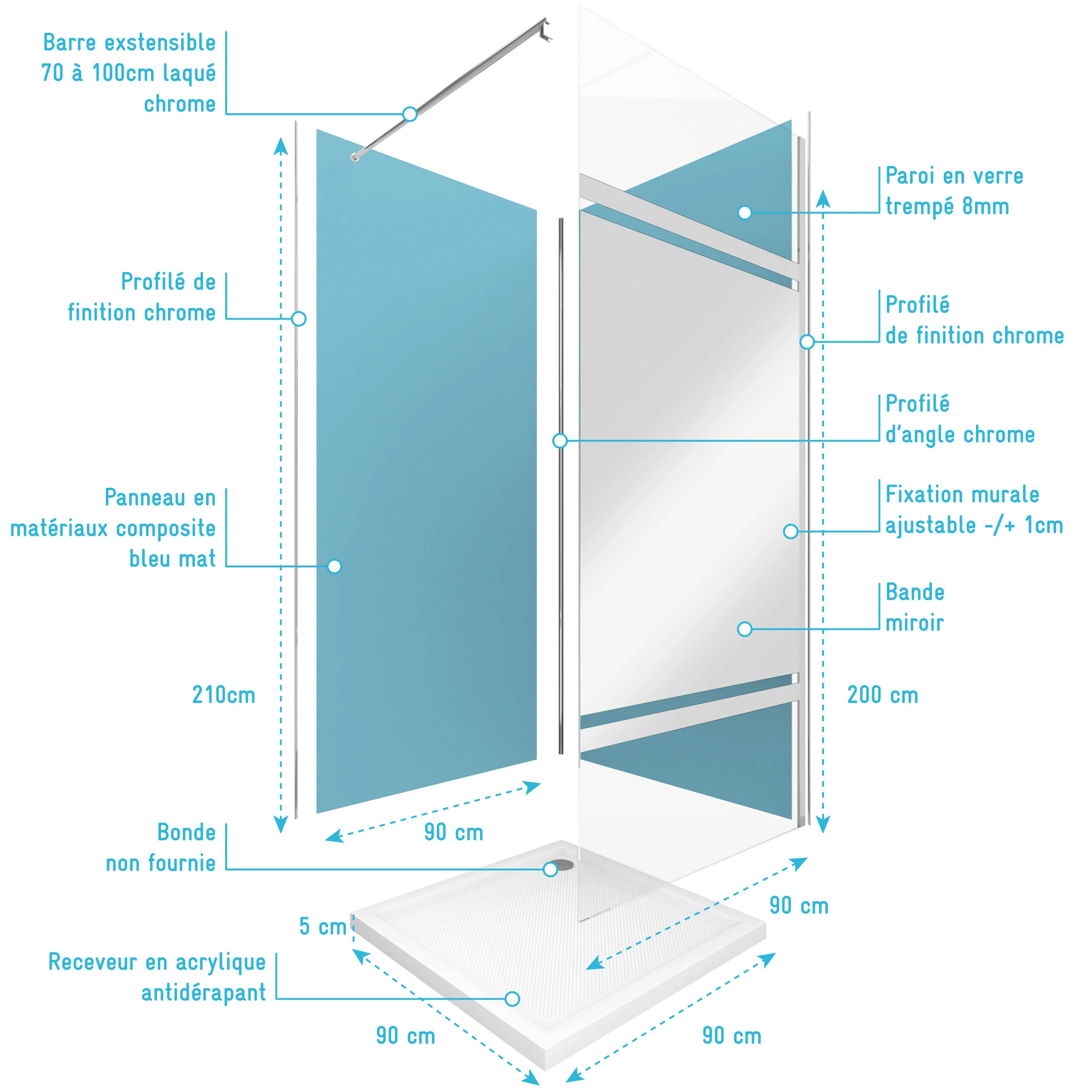 Pack Douche a l’Italienne 90×90 – Kit Panneaux Muraux Bleu/Chrome + Receveur + Paroi Miroir 8 mm