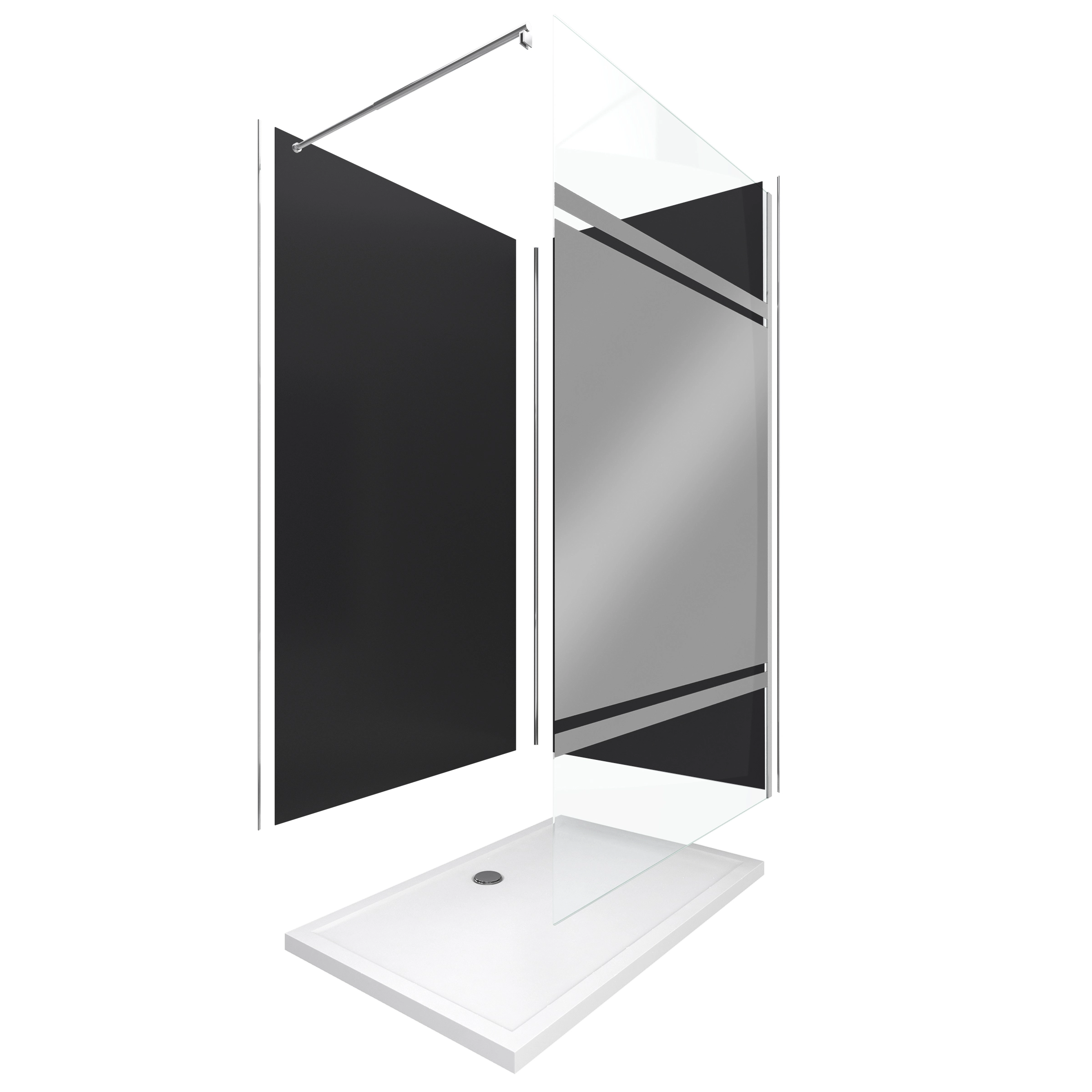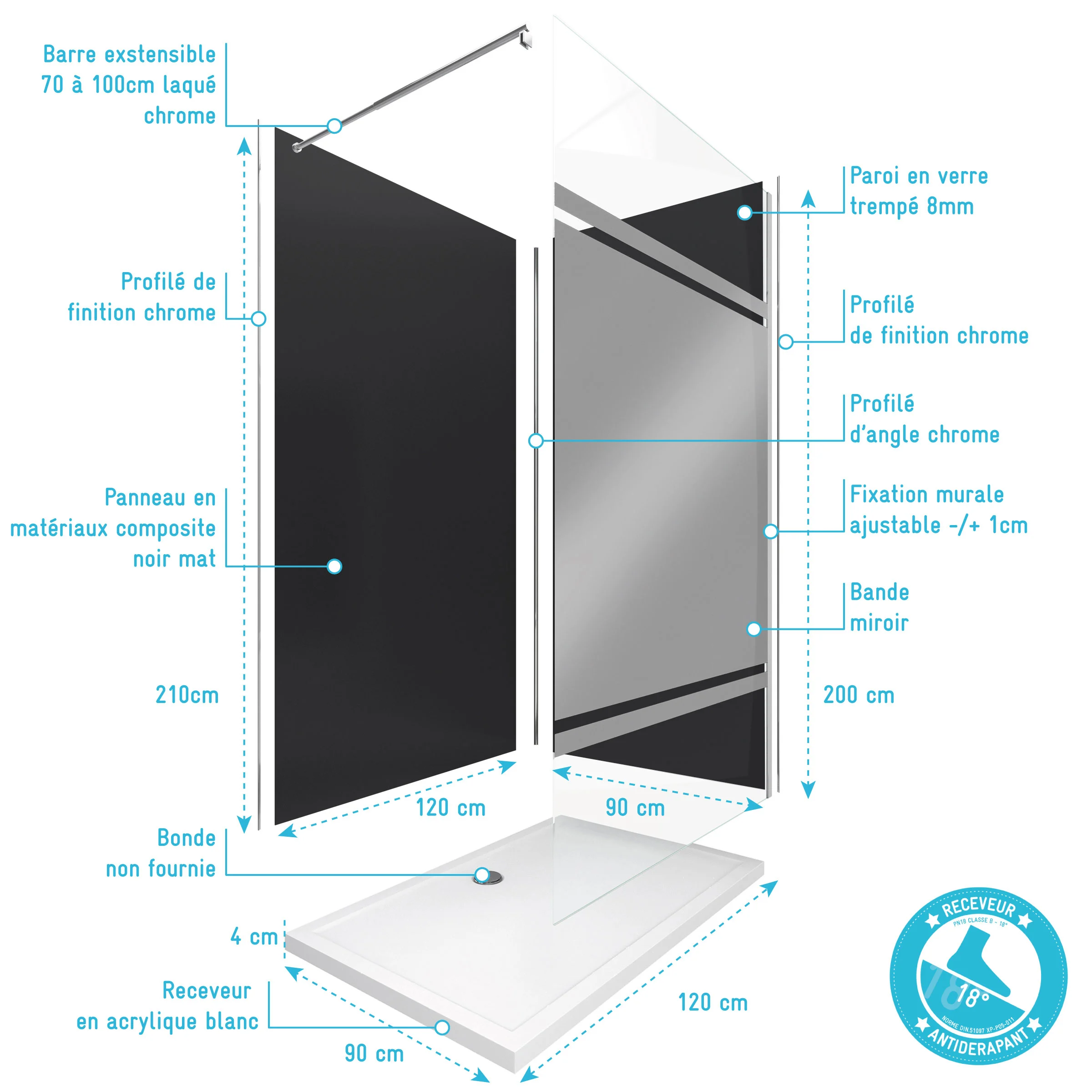 Pack Douche a l’Italienne 90×120 – Kit Panneaux Muraux Noir/Chrome + Receveur + Paroi Miroir 8 mm