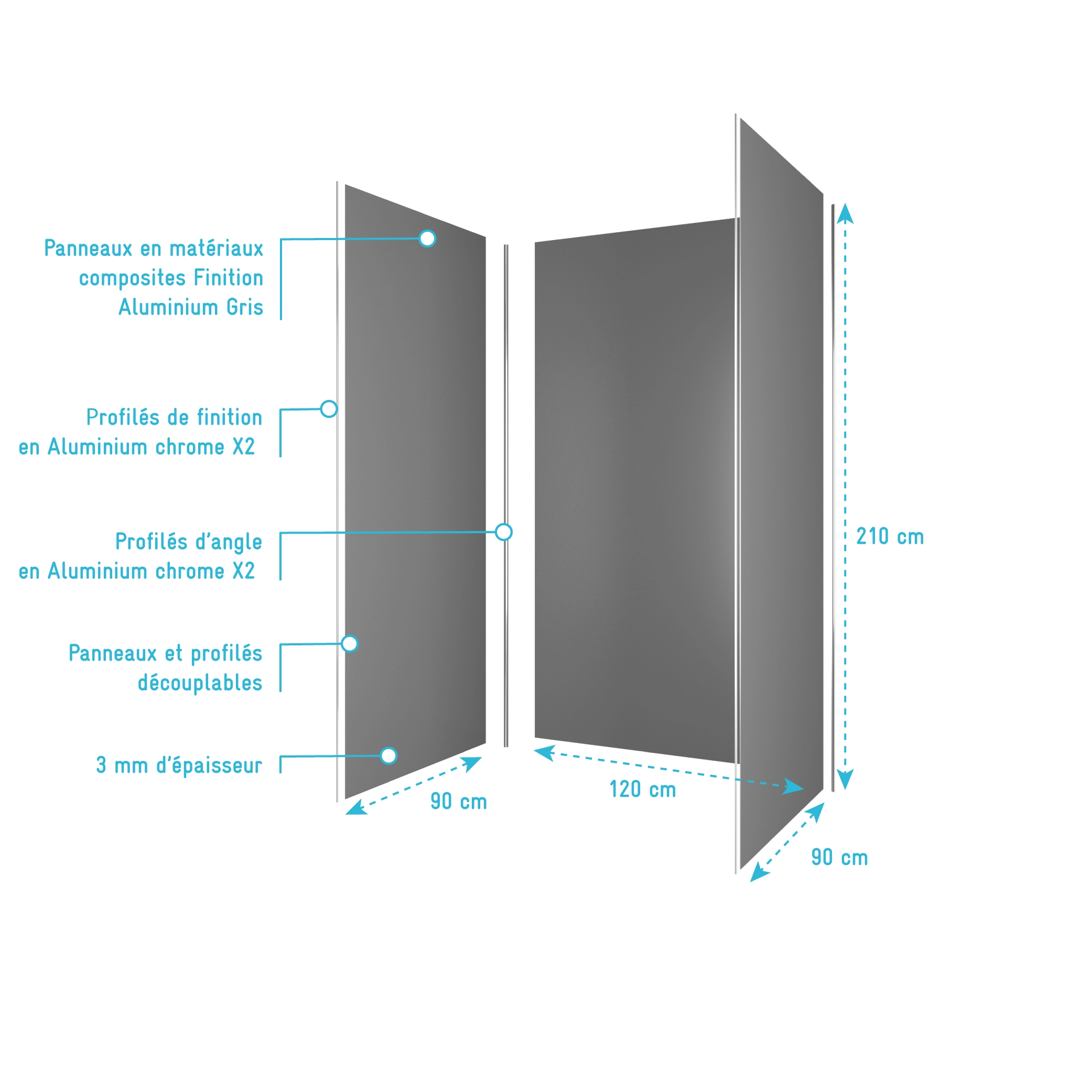 - 2 Panneaux de 90×210 cm + 1 Panneau de 120×210 cm en Aluminium Gris recoupables