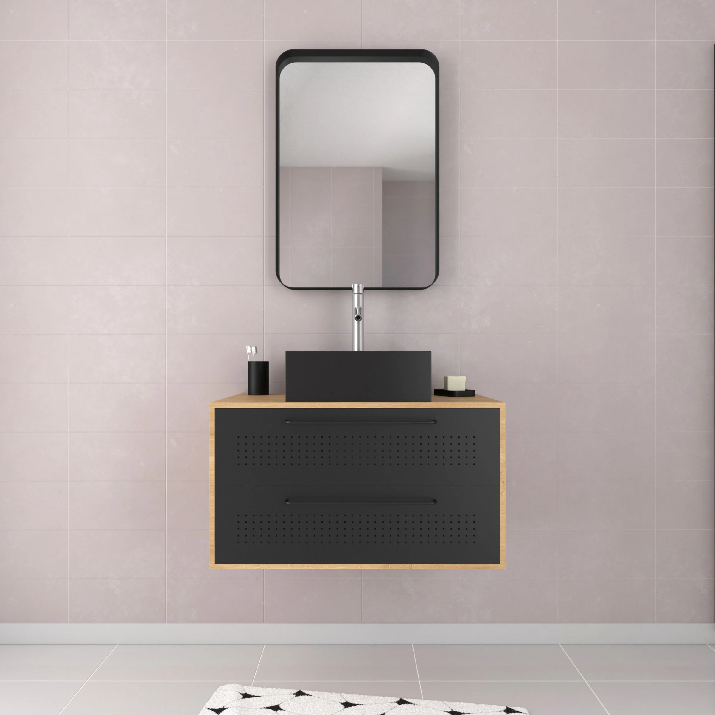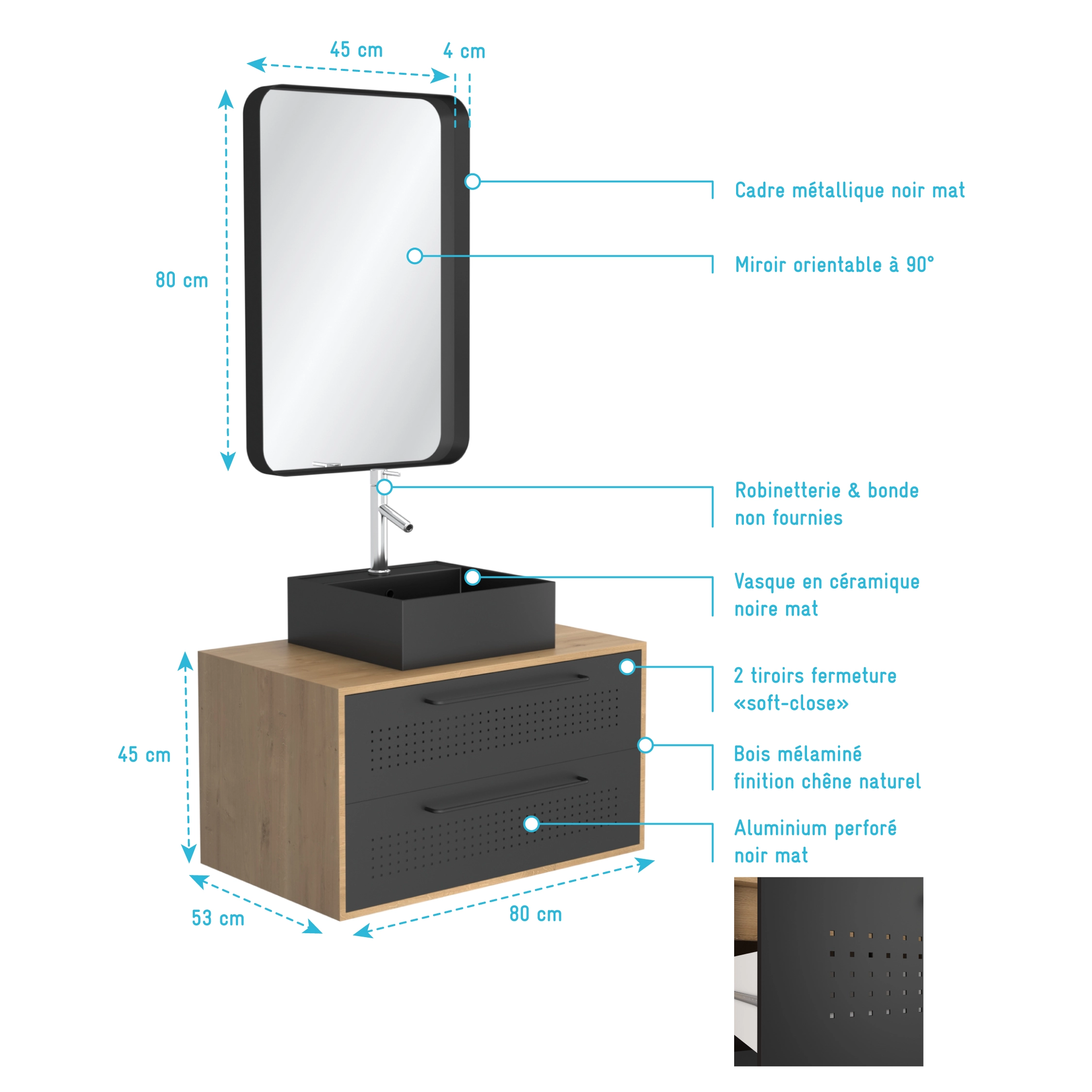2 avis pour Meuble Salle de Bains 80 cm, Vasque Carrée et Miroir – Chêne naturel et Noir Mat – UBY